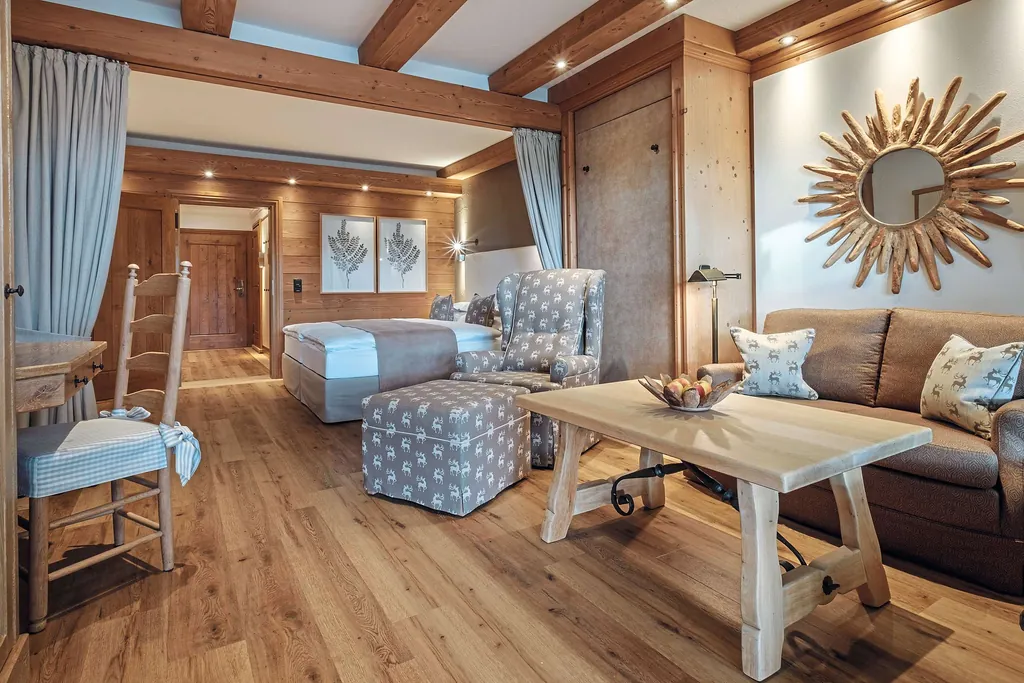 Doch niemand muss seine Privatsphäre verlassen. Jedes Chalet bietet alles, was das Leben luxuriös und leicht, großzügig und genussvoll macht: Spa-Bereich mit Indoor-Wellnessdusche, finnische Sauna mit Panoramablick und Hot Pot aus Edelstahl auf der Terrasse. Innen duftet das massive Lärchen- und Fichtenholz von Wänden, Böden und handgefertigten Möbeln. Die offene Almküche mit hochwertigen Geräten, die LaKra-Grillschale im Garten und ein großer Essbereich samt gemütlicher Eckbank laden zum Kochen mit der ganzen Familie ein. Wer sich lieber verwöhnen lassen will, kann frische, vorgekochte Speisen in Einweggläsern oder Grillpakete im Bauernshop im Hauptgebäude kaufen, wo auch regionale Produkte wie Schinken und Käse angeboten werden. Getränke, genauer gesagt eine erlesene Auswahl an Bieren, Weinen und Champagner, gibt es auch im Chalet. Und mit etwas Glück lässt sich durch die bodentiefen Fenster ein Hirsch beobachten, der die Ruhe der Umgebung genießt.