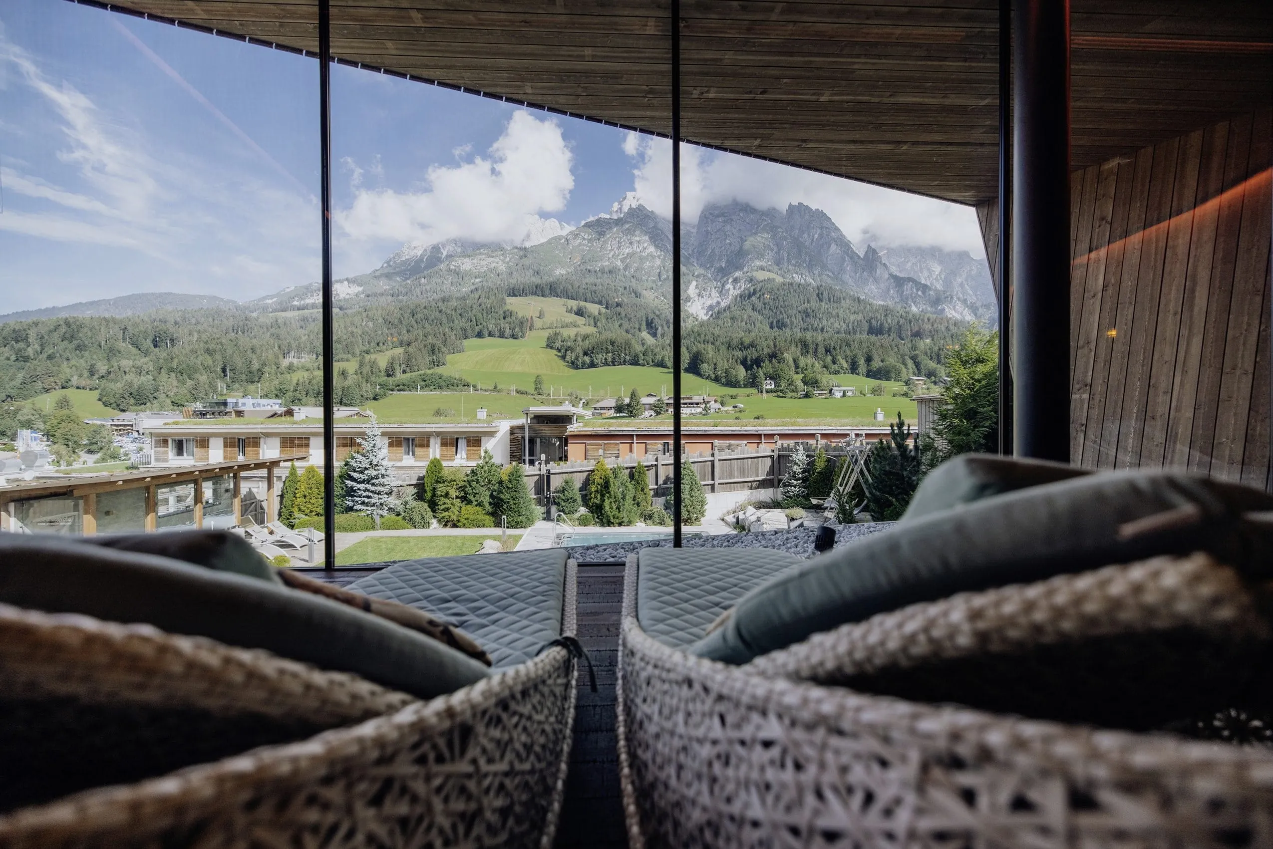 Platz ist ein großer Luxus, mit dem das Wellnesshotel im Salzburger Land besticht, jedoch auch mit dem stylischen Interieur und den bodentiefen Panoramafenstern. Davor erstrecken sich die mächtigen Felsen des Gebirgsstocks Steinernes Meer.