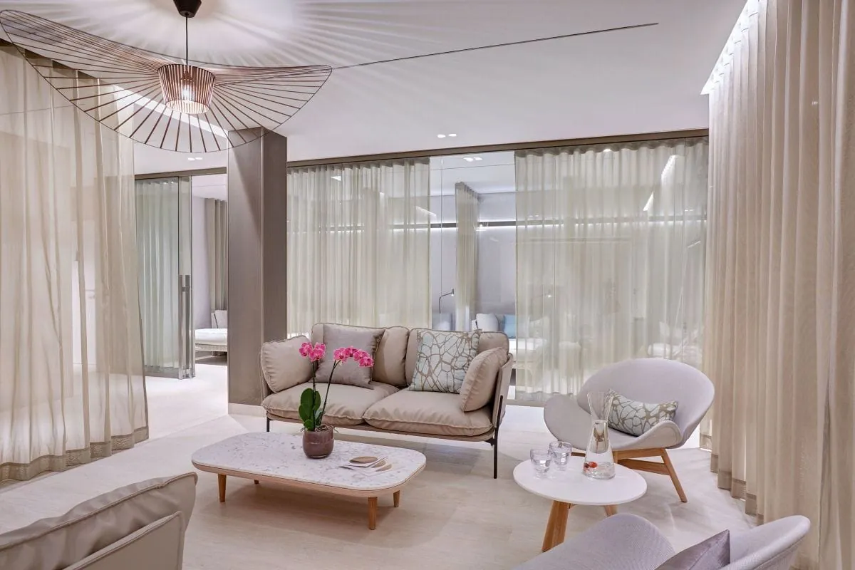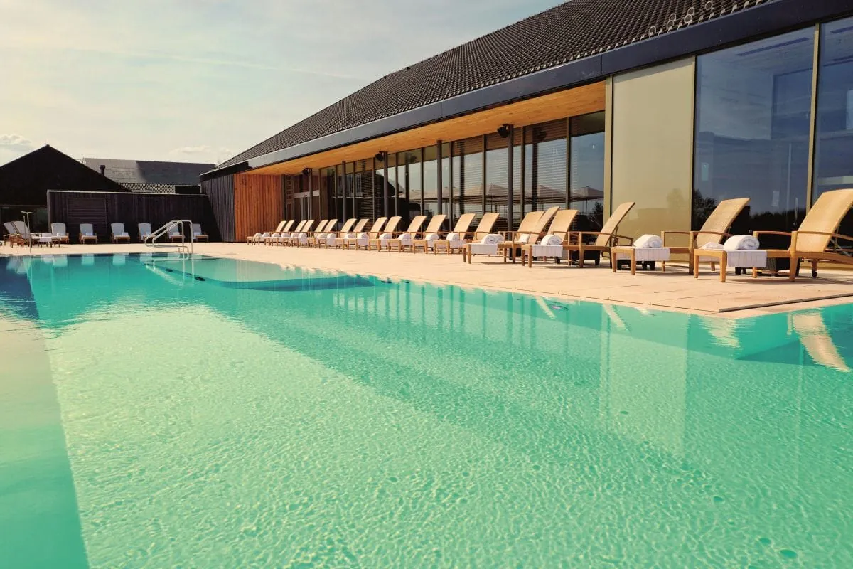 Geschmackvoll sind handgefertigte Fliesen mit gebürstetem Stahl kombiniert. Lichtdurchlässige Vorhänge aus Naturgarnen dienen als Raumteiler und Sichtschutz, Designer-Leuchten sorgen für gedämpftes Licht. Keine Frage: Hier waren Meister der Interieur-Gestaltung am Werk! Für private Wellnessmomente lassen sich die private Sauna, die stylische Badewanne auf dem nicht einsehbaren Balkon und das Liegenetz nutzen. Von hier aus blicken die Gäste auf den 5.000 qm großen Hotelpark mit seinem alten Baumbestand und den zahlreichen Ruheinseln, die sich um den schön angelegten Outdoorpool gruppieren. Dieser ist übrigens für ungestörte Zweisamkeit exklusiv buchbar.