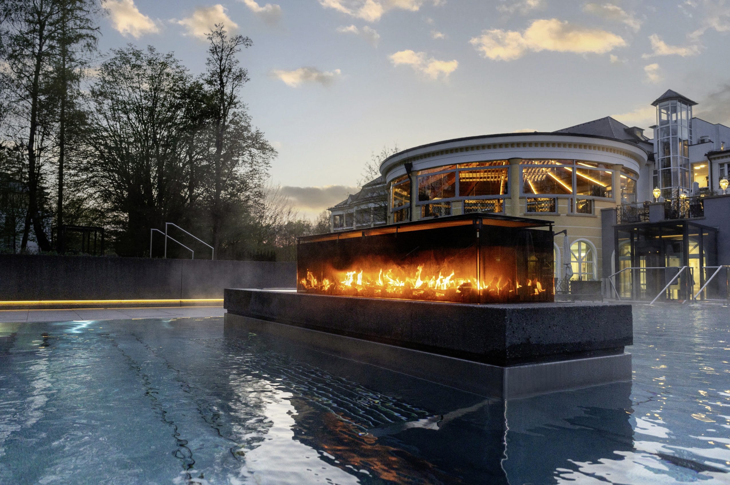 Außergewöhnlich elegant ist auch das neue „Mangfall Spa“ mit seinem Saunabereich, der Eislounge und dem 20 Meter-In-/Outdoorpool. Wie auf einer Insel fühlt man sich in allen Bereichen, die von fließendem Wasser umschlossen sind und somit eine einzigartige Aura der Stille verströmen. Die Natur ins Innere holen auch die mannshohen „Baumarien“: gläserne mit meterhohen Bäumen bepflanzte, himmelwärts offene Lichtschächte.