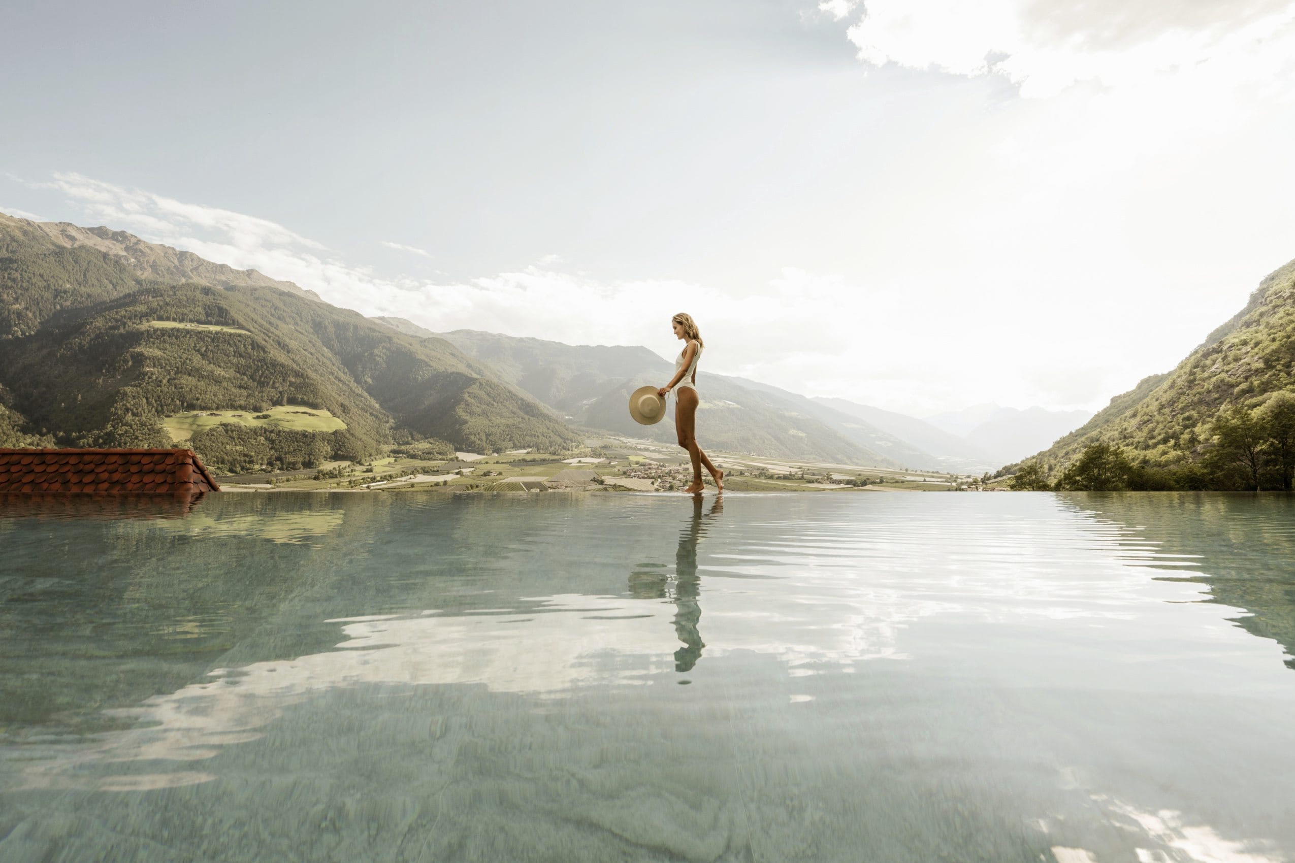 Willkommen im Reich der Superlative: 13 Pools, 23 Saunen und noch mehr Sportmöglichkeiten – das ist der Quellenhof im Passeiertal. Ein über Jahrzehnte gewachsenes Resort, das eine visionäre Idee nach der anderen umsetzt. Wie den Glaspool in Blütenform, dessen spektakuläre Konstruktion am Eck des Rooftops waghalsig in den Himmel ragt.