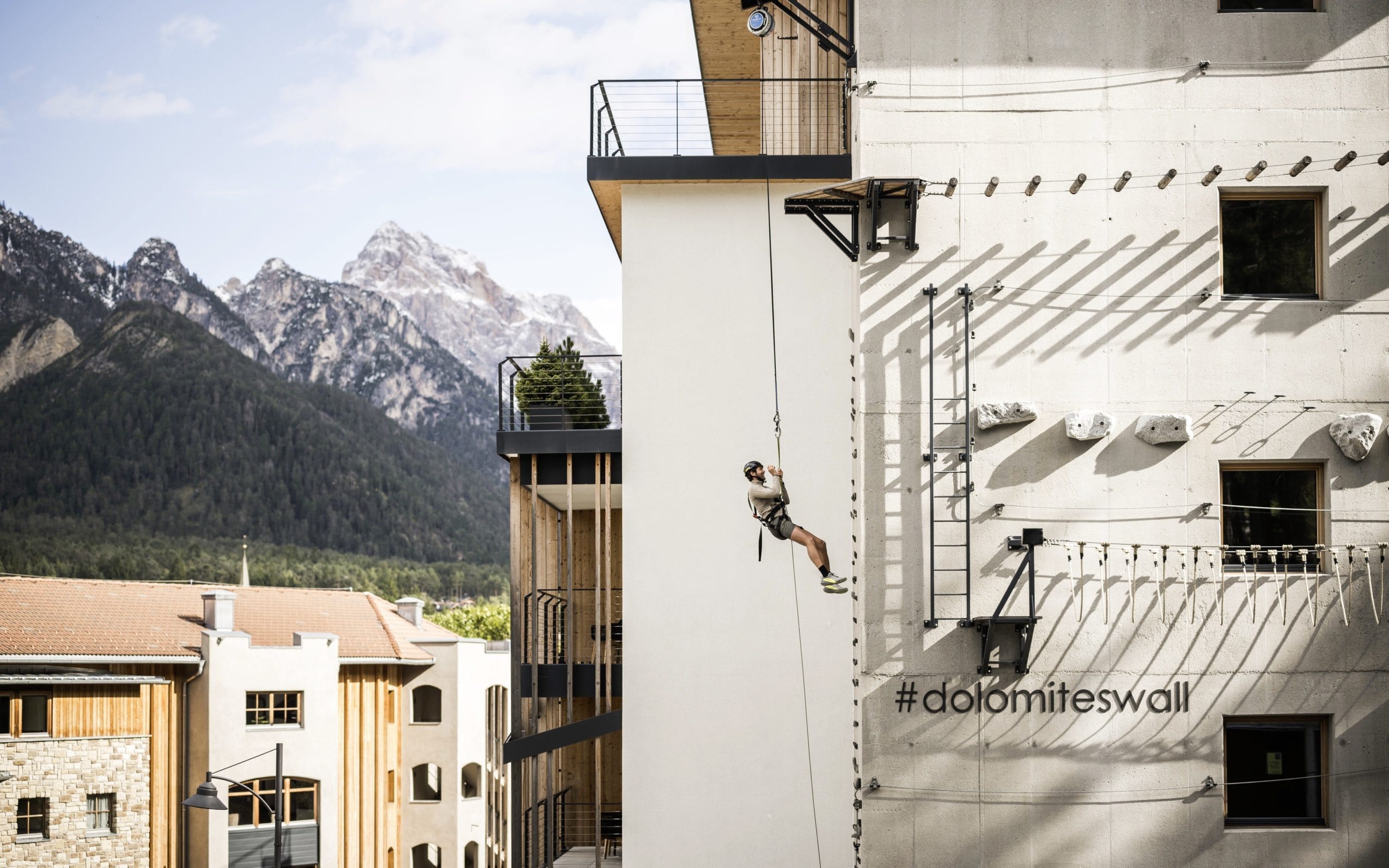- „Dolomiteswall“: Kletterwand an der Hausfassade mit Kletterroute und -steig