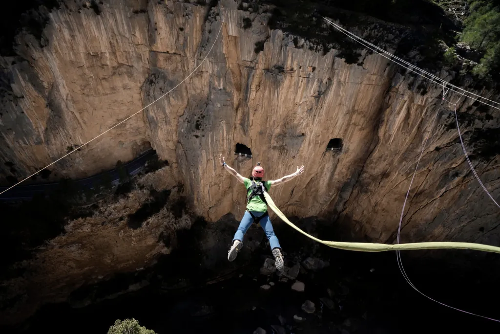 Beim Bungee-Jumping springt man von einem hohen Bauwerk – wie Brücken oder Türmen – meist kopfüber in die Tiefe. Nervenkitzel pur! Der freie Fall wird von einem Gummiseil, das an den Füßen des Springers und der Absprungplattform befestigt ist, abgebremst. Nach Erreichen des tiefsten Punktes, in einem genau berechneten Sicherheitsabstand über dem Untergrund, wird der Springer vom Gummiseil wieder nach oben gezogen.