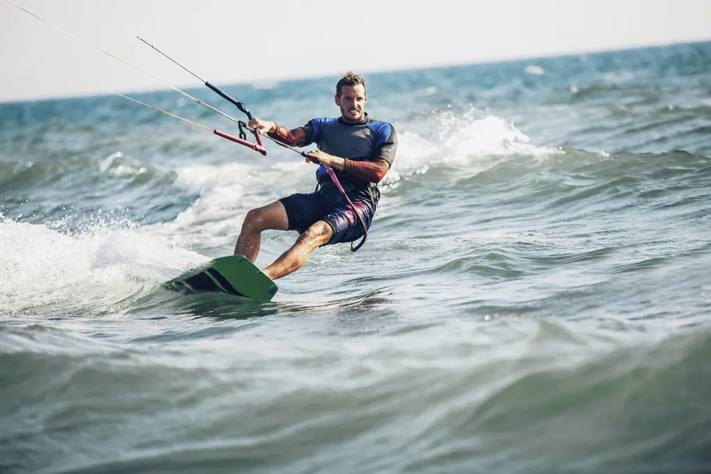 Kitesurfen ist eine Sportart, bei der man auf einem Brett stehend von einem Lenkdrachen über das Wasser gezogen wird. Das Kitesurfen ist komplex und vielseitig. Es ist nicht leicht zu lernen und birgt einige Risiken. Deswegen ist es sinnvoll, einen Kitesurfkurs zu absolvieren. Häufig wird das Kitesurfen in Stehrevieren gelernt. Stehreviere sind große Flächen mit hüfthohem Wasser. Dort lernt man, wie man das Kite steuert und wie man landet und lenkt. Gelenkt wird beim Kitesurfen mit der sogenannten Bar. Zieht man an einer Seite der Bar, verkürzt sich die Steuerleine und das Kite lenkt in die entsprechende Richtung. Beim Kitesurfen sollte die Ausrüstung gut sitzen und auch aufeinander abgestimmt sein. Für diesen Adventure Sport wird ein Board, ein Drachen und eine entsprechende Sicherheitsausrüstung benötigt.