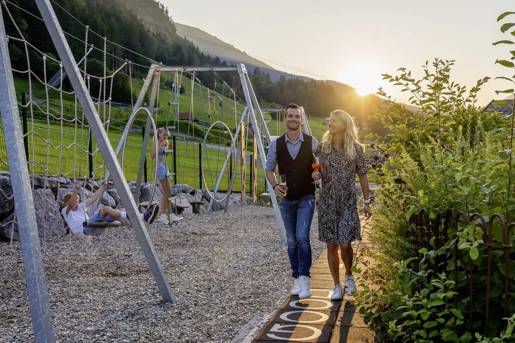 Kinder erleben naturnahe Kinderbetreuung auf dem Outdoor-Abenteuerspielplatz mit Piratenschiff, Eltern genießen himmlische Entspannung im „Heaven Spa“, beim Yoga oder in der preisgekrönten Bar aus 16.000 Eichenholzwürfeln. Absolute Highlights sind der Bio-Bauernhof und das Hauben-Restaurant „ESS:ENZ“.