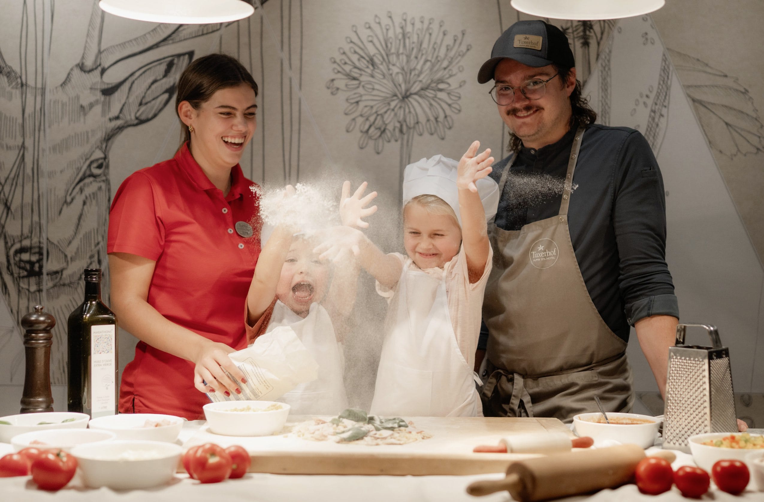 Der Nachwuchs hat im betreuten Wochenprogramm viel Abwechslung: von Kinderdisco und Videoabenden über Kinderyoga bis zu Kochkursen wie Apfelstrudel backen, Pizza zubereiten oder Kinder-Cocktails mixen. Währenddessen entspannen die Eltern im 2.200 Quadratmeter großen Alpin Spa mit Sunset-Relaxpool auf der Dachterrasse, Saunen und gemütlichen Ruhebereichen. Kulinarisch punktet das Fünf-Sterne-Haus mit frischer regionaler Küche, Gourmet-Abendmenü und eigenem Kindertisch.