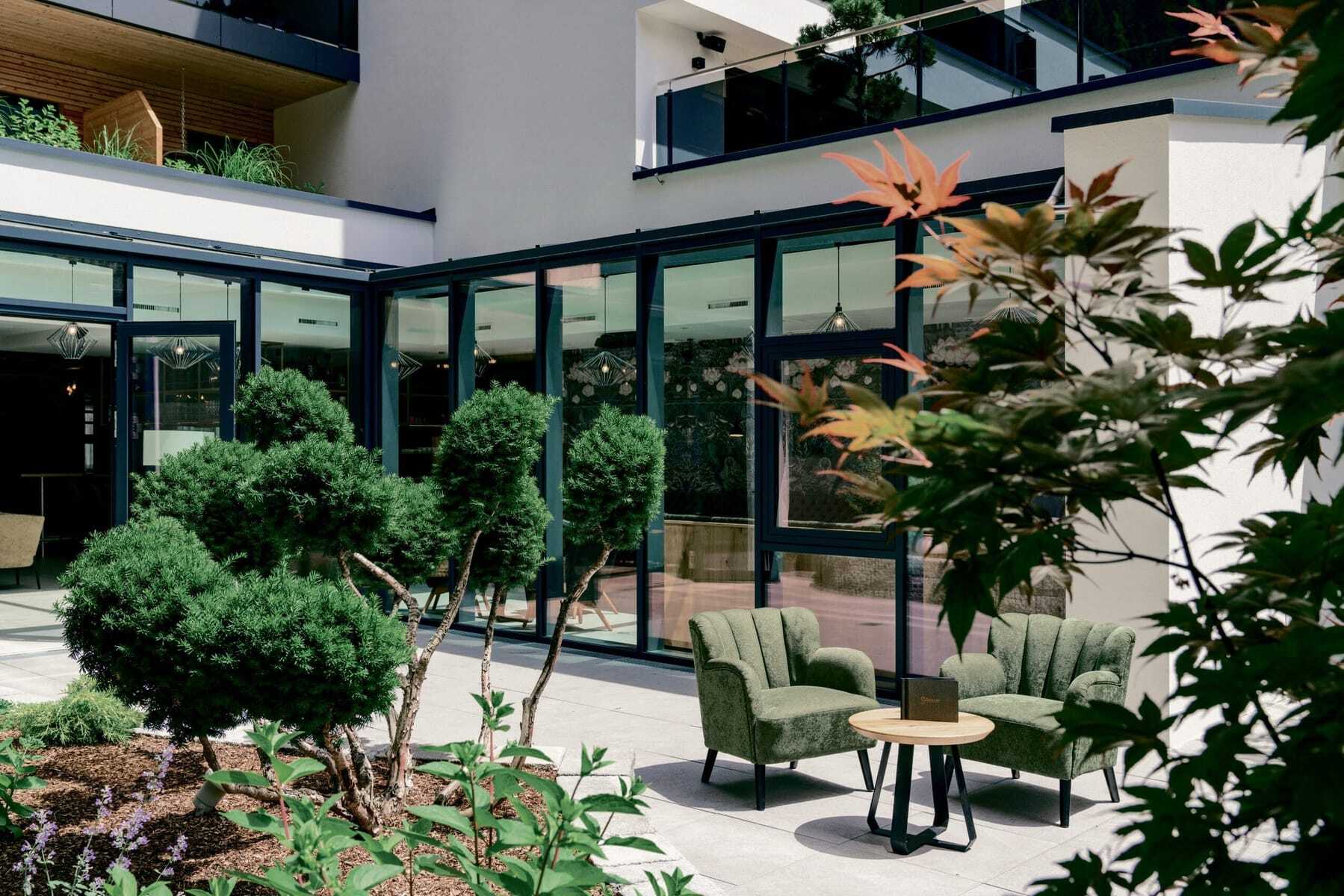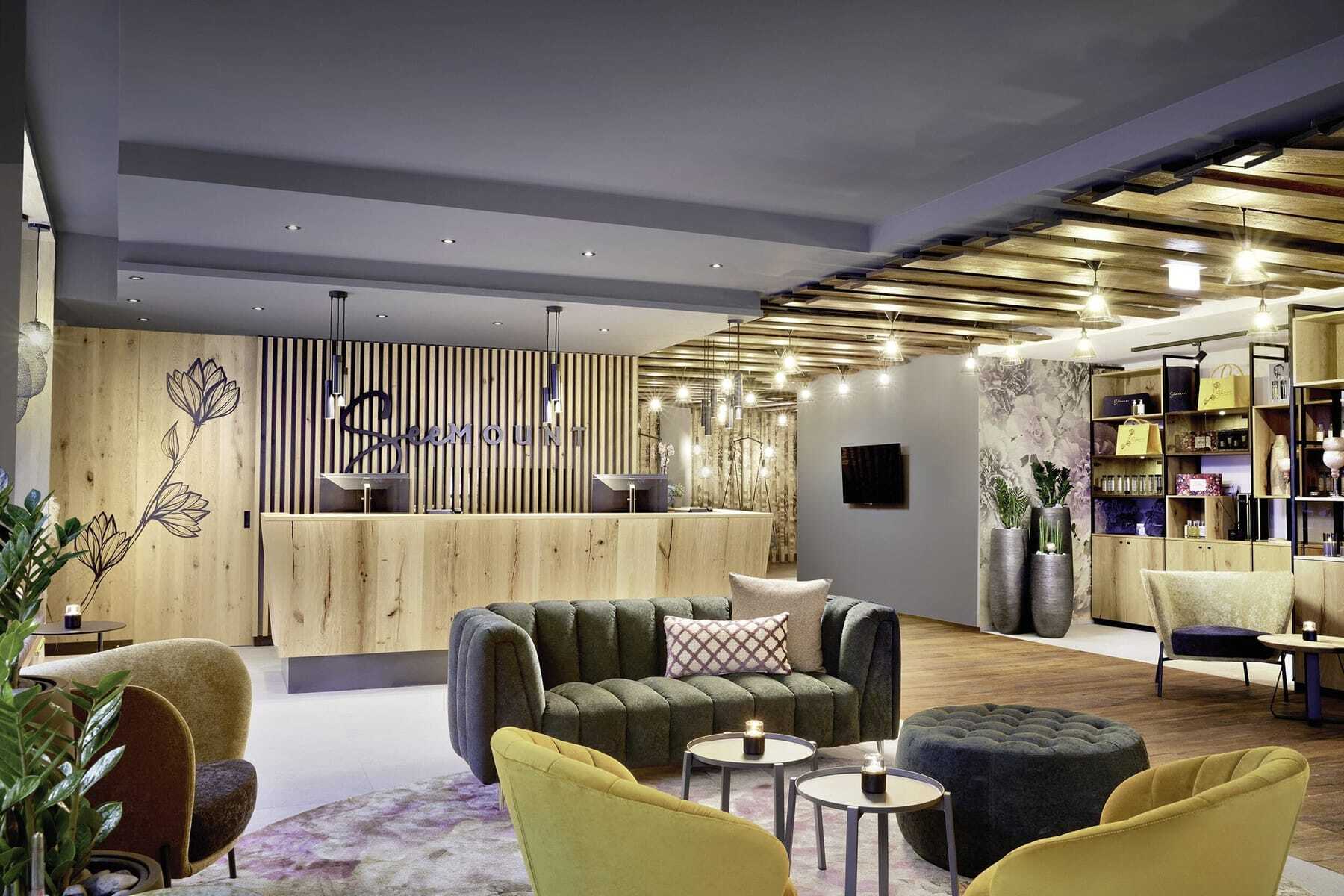 Geheimtipp für aktive Genussmenschen, die das Schöne lieben: Am Eingang des Paznauntals auf 1.040 m Höhe, wo die meisten Touristen vorbei nach Ischgl rauschen, liegt der kleine Ort See. Hier eröffnete 2021 das SeeMOUNT, direkt neben der Bergbahn. Ein architektonisch auffallender Bau aus dunkelgrauem Granit und Lärchenholz. Die Fassade glitzert, wenn die Sonne darauf scheint. Ganz besonders ist auch der erste Eindruck beim Betreten der Lobby: viel Platz, Designermöbel, jung, modern und stylisch und doch gemütlich mit viel Eichenholz und hochwertigen Materialien aus der Region.