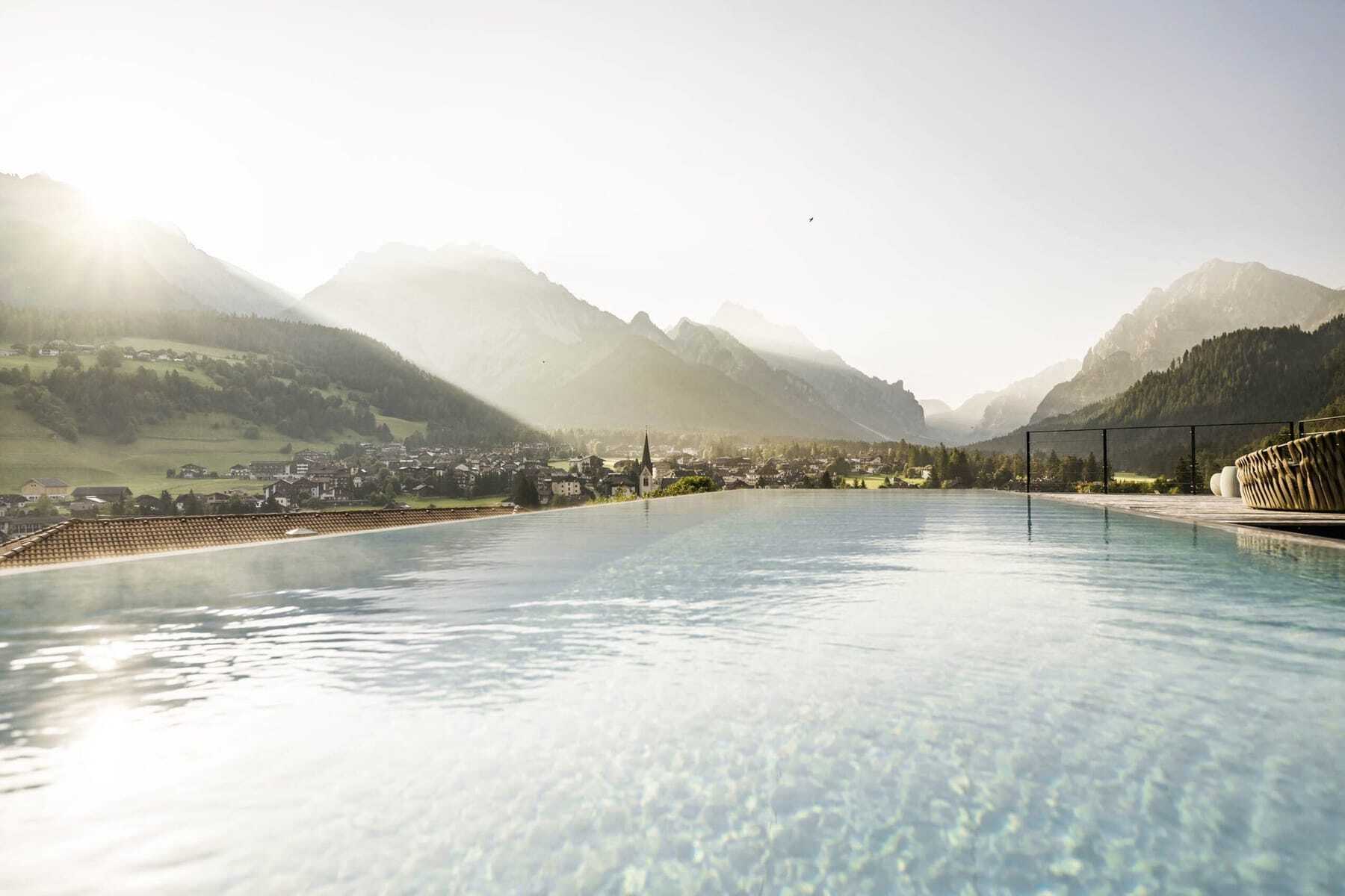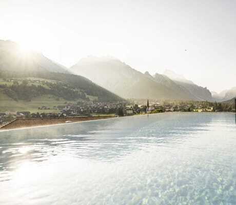 Die Sonne meint es gut mit uns in diesen Herbsttagen und so entspanne ich nach ein paar Zügen im paradiesischen Panorama-Infinitypool auf meiner Liege im »Dolomites Sky Spa« (adults only) und blicke in die Baumwipfel des unmittelbar angrenzenden Waldes. Insgesamt 2.500 qm stehen den Gästen hier für das Relaxen nach dem Sport und den Aktivitäten zur Verfügung. Darunter eine Panoramasauna, Forest Infrarotsaunen und elegante Ruhebereiche. Komplettiert wird das Spa-Angebot von einer umfangreichen Auswahl an Wellness-Behandlungen auf Basis von Alpenkräutern, Bergblumen und Zirbenholz. Für Begeisterung bei Eltern mit Kindern sorgt das neu gestaltete »Dolomites Family SPA« mit Wasserfall-Pool, Kinderbecken mit Kletterwand und Wasserrutsche.