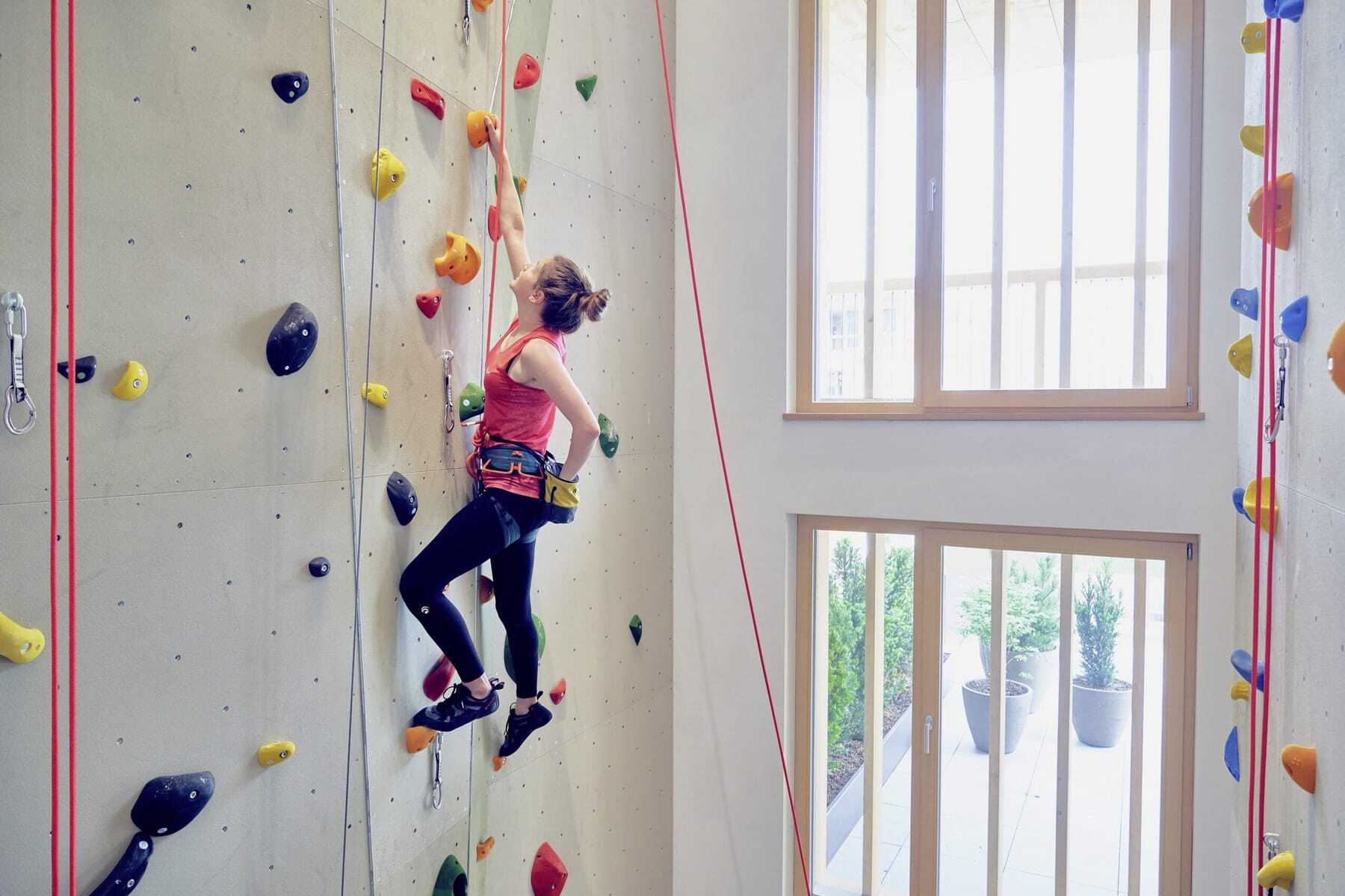 Doch beginnen wir beim Interieur, entworfen von Matteo Thun. Es erzählt von Bewegung und Erdverbundenheit zugleich: reduziertes Design, nachhaltige Materialien, klare Linien. Das Besondere – Sport ist hier bis ins Detail integriert. In den stilvoll gestalteten Zimmern treffen Naturmaterialien auf überraschende Akzente: Hanteln von erstklassigen Herstellern liegen bereit, Klettergerüste wurden an den Wänden installiert, Medizinbälle, Yogamatten – nicht nur als Hingucker schön, sondern auch eine Einladung zur spontanen Bewegung. Selbst die Kunstwerke in Lobby und Gängen greifen das Thema Aktivität auf, etwa in Form von Skulpturen aus alten Tennisschlägern oder Bildern aus Golfbällen.