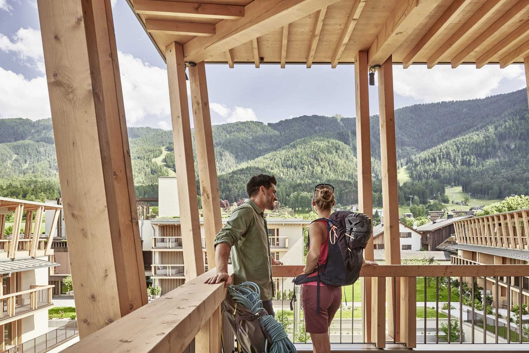 Wer gezielt trainieren möchte, findet im Technogym-Fitnessraum modernste Geräte vor, von Cardiostationen bis zu funktionalen Trainingsmodulen. Lichtdurchflutet und großzügig motiviert der Raum dazu, Körper und Geist in Balance zu bringen. Höher hinaus möchte so mancher, der sich an der spektakulären Indoor-Kletterwand versucht. Doch eigentlich ist die Natur hier der Star und animiert jeden Tag zu neuen Aktivitäten: Bike-Trails, Paragliding-Abenteuer, eine Golfrunde im Golf Club Pustertal gegenüber (Greenfee inklusive). Der USP? Die Lage in 200 Metern von der Seilbahn zu Südtirols Skiberg Nummer eins – dem Kronplatz – mit seinen 120 Pistenkilometern (inklusive der legendären schwarzen Pisten »Black Five«!) und mit seinen zahlreichen Wanderwegen im Sommer.