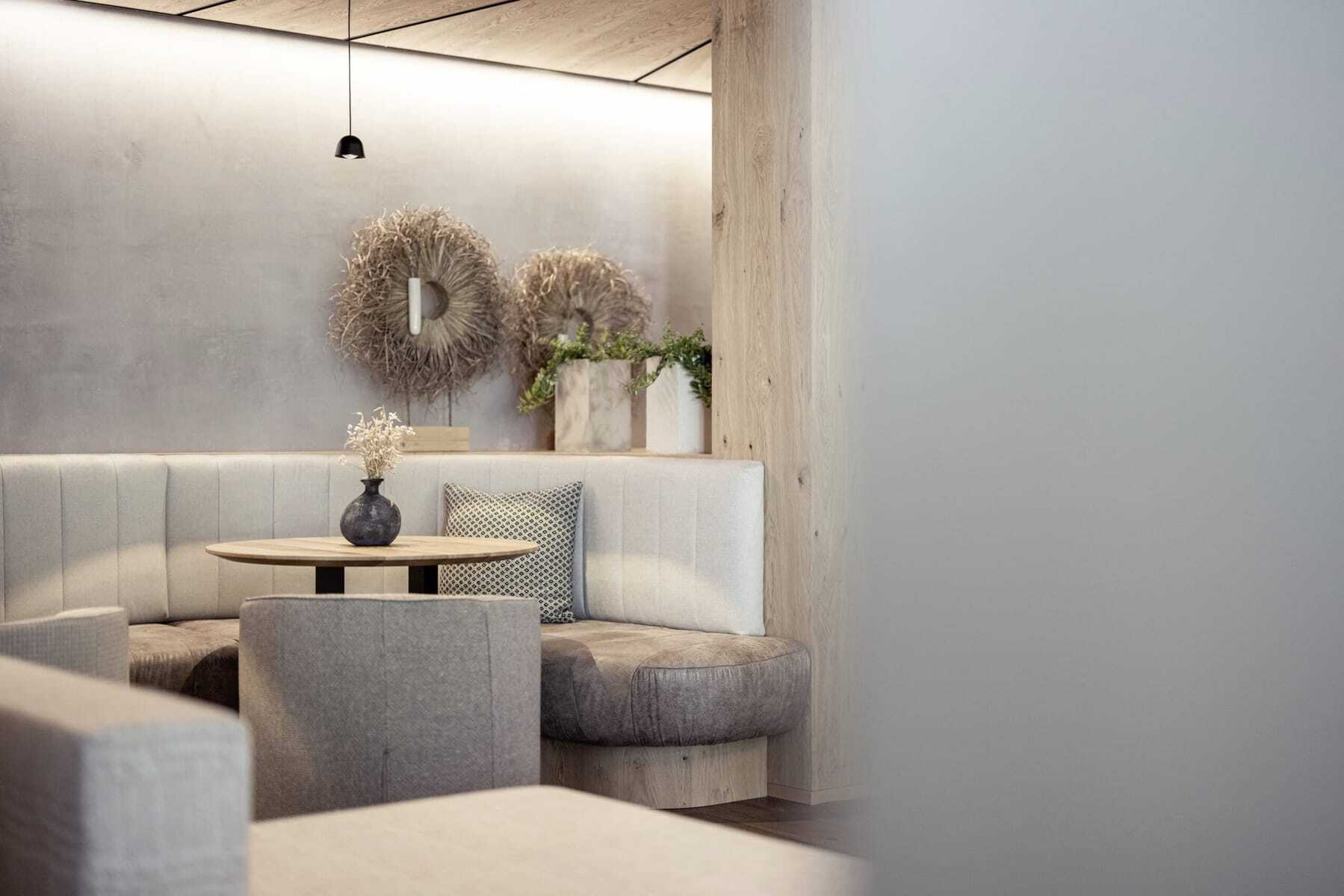 reduziertes Interieur in Leinen und Grau mit gekreuzten Streifen an der Decke im Hotel Winkler