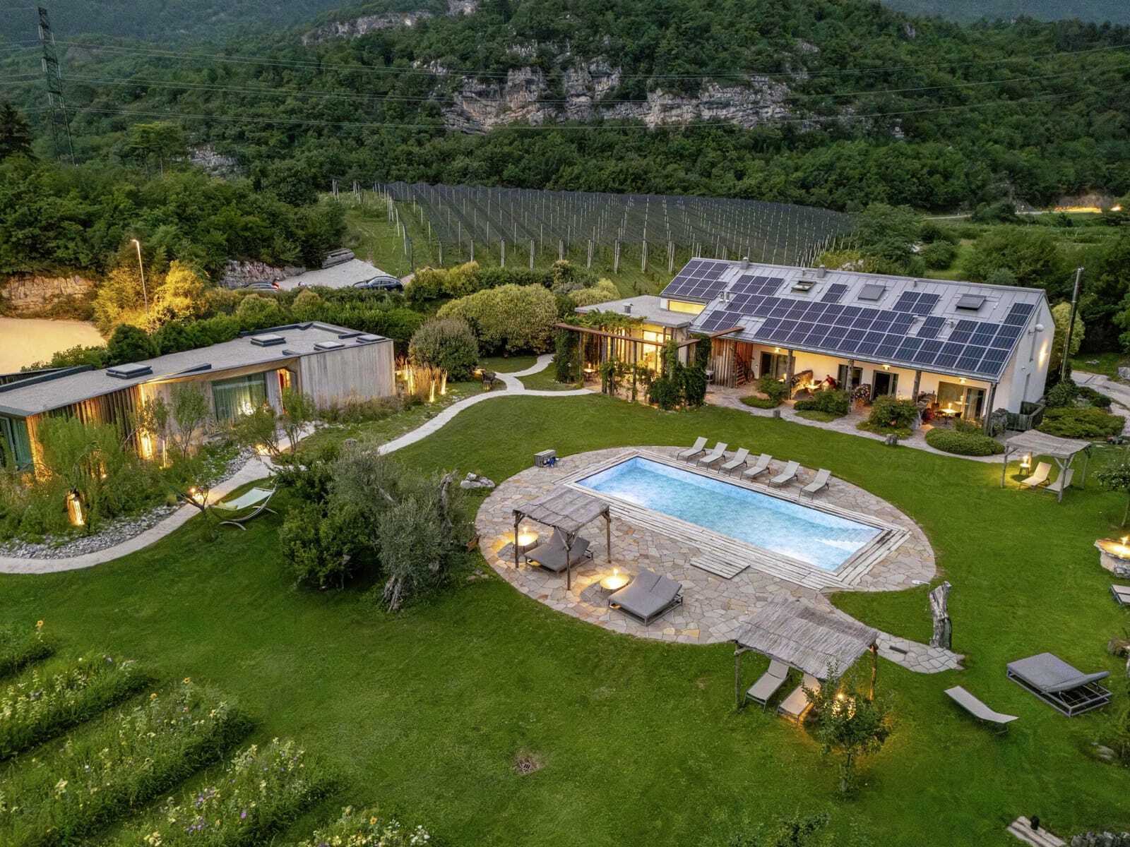 Nachhaltiges Urlaubsparadies mit Bioschwimmbad im Garten und Genuss aus regionalem Anbau – mitten im Valle dei Laghi, das für Outdooraktivitäten wie geschaffen ist.