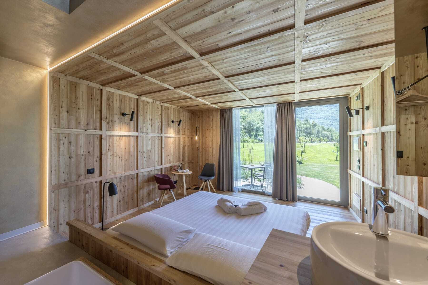 Zimmer komplett aus Holz und bodentiefen Fenstern, durch die man auf den Outdoorpool im Agritur La Dolce Mela sieht
