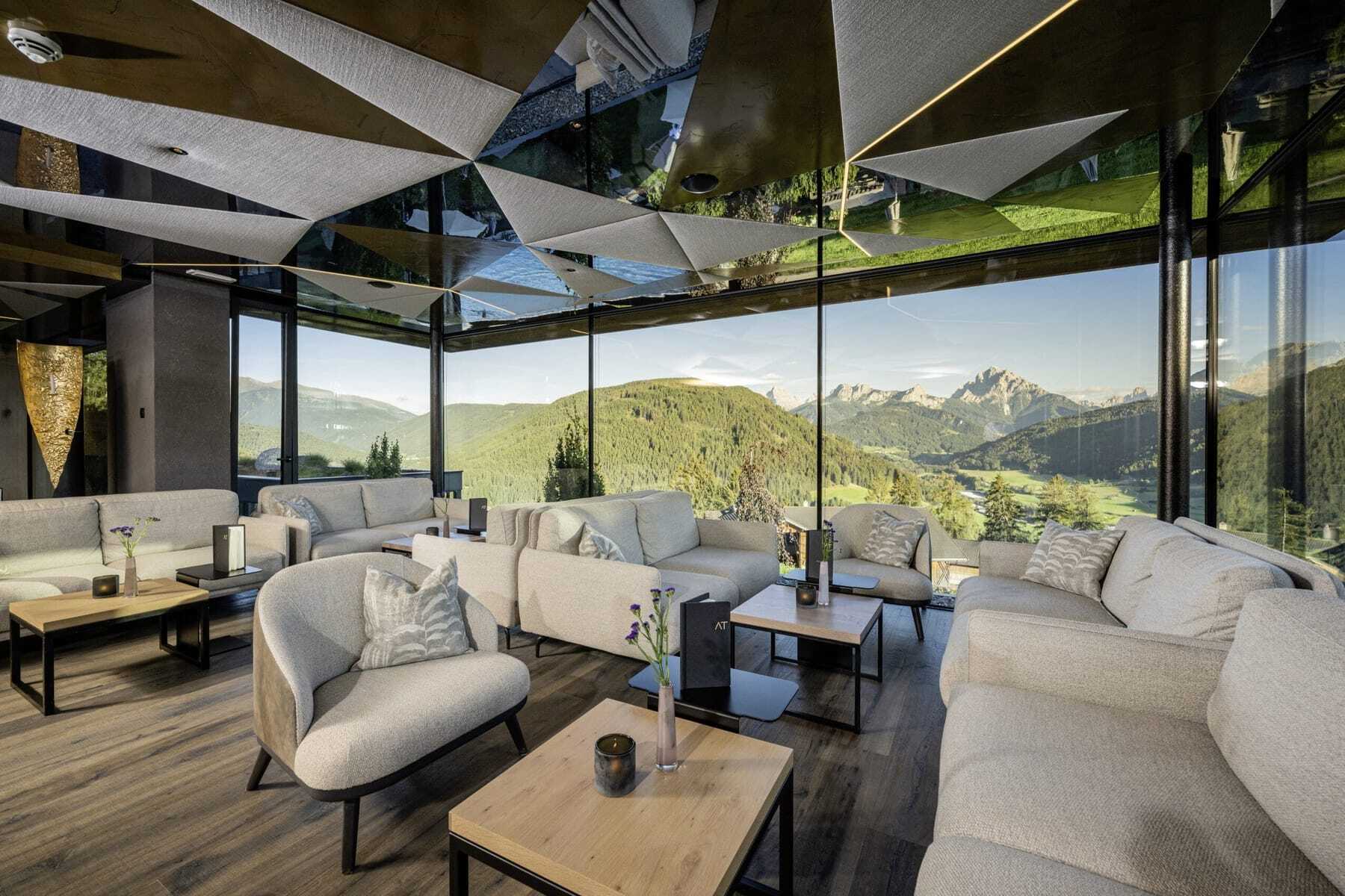 Die hellen Zimmer und Suiten mit ihrer luxuriösen Ausstattung spiegeln das wohnliche Ambiente der öffentlichen Bereiche wider – mit ihren gemütlichen Schaukelsesseln vor großen Glasfronten, Designerteppichen in warmen Tönen und einer Hotelbar mit Ausblick – natürlich! – auf die Dolomiten. Kein Wunder, dass hier nach dem köstlichen Dinner mit vorzugsweise regionalen Zutaten im Panoramarestaurant viele Gäste noch lange verweilen und beim Anblick der rot glühenden Gipfel ins Schwärmen geraten. Einer von vielen Wow-Momenten!