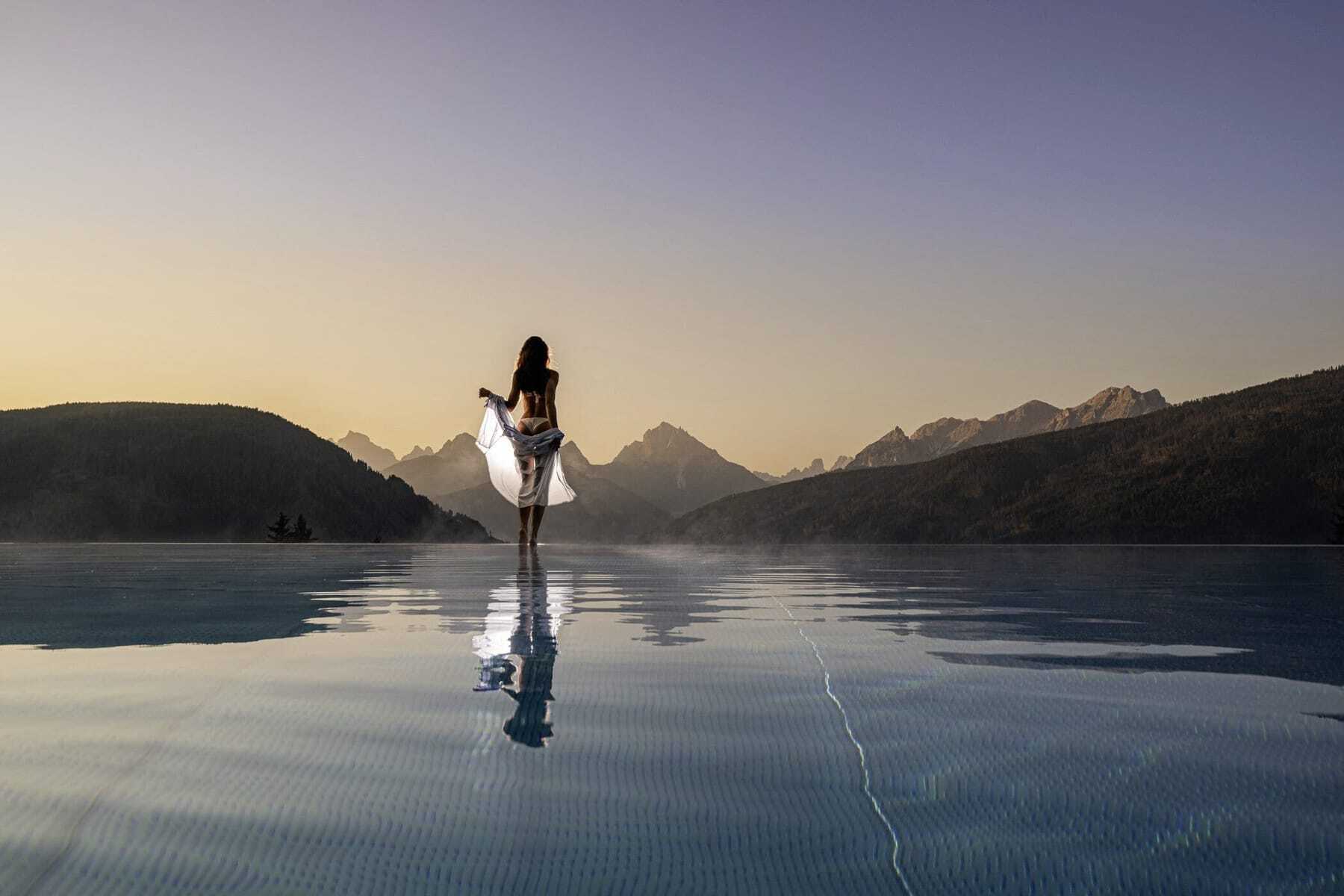 Zusammen mit ihrem Mann Johannes ist sie mit dem Umbau seines elterlichen Betriebes 2018 ein Wagnis eingegangen, das sich längst ausgezahlt hat: Durch große Glaselemente, Holz und Metall wurde der ehemalige »Alpenhof« meisterhaft in einen hochmodernen Hotelkomplex verwandelt, der hoch oben über dem Ort Taisten im Südtiroler Gsieser Tal in Alleinlage thront. Die imposanten Gipfel der Dolomiten bilden die majestätische Kulisse für dieses Panorama Wellness Resort, das seinem Namen alle Ehre macht. Weit hin schweift der Blick vom 4.000 qm großen Wellnessareal – fein getrennt nach Family- und Erwachsenenbereich – auf die felsigen Gipfel, das Pustertal und den Kronplatz. Im Sonnen-Infinitypool des Fünf-Sterne-Hotels schwebt man quasi in Richtung der imposanten Bergwelt. Locker gruppieren sich im Adults only-Bereich mit seinem vielfältigen Saunaangebot die Sonnenliegen im Halbrund um eine große Feuerstelle. Aufgrund der Weitläufigkeit des Resorts findet hier jeder garantiert seinen Lieblingsplatz, eingebettet in die top-gepflegte Gartenlandschaft mit den wunderschönen Blumenrabatten und Skulpturen.