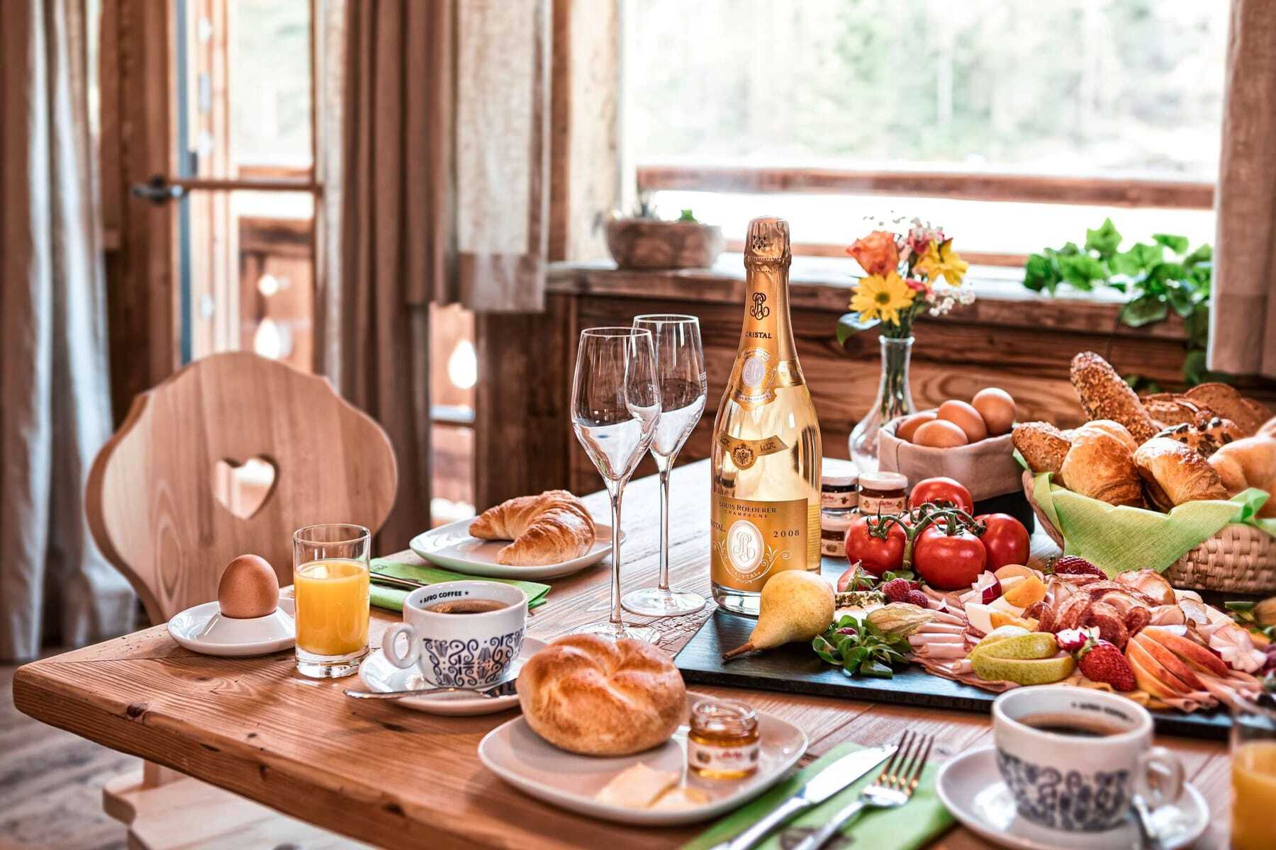 Der Almfrühstückskorb wird auf- und abgedeckt, zu jeder anderen Tageszeit kann ich mir à-la-carte aus dem dazugehörigen Restaurant »Prechtlstadl« etwas ins Chalet liefern lassen. Auch Fondue, Tatarenhut oder Koch- und Grillboxen. Und das sieben Tage die Woche. Zum individuellen Full-Service-Konzept für die maximal 34 Gäste gehört auch, dass auf Wunsch Kosmetikerin, Friseurin und Yogalehrerin ins Chalet kommen. Oder die Chefin selbst für eine Achtsamkeitsmeditation, Burnout-Prophylaxe oder ein Gesundheitscoaching. So fühlt sich wahre Freiheit an.