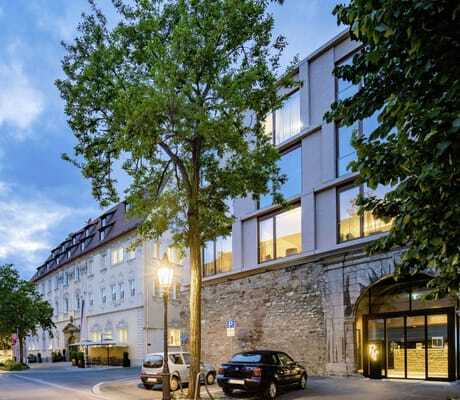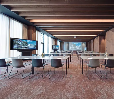 Kleinere Gruppen bevorzugen gerne die Möglichkeiten im Stammhaus mit der »Bibliothek« und vier weiteren kombinierbaren Konferenzräumen. Optimale Voraussetzungen für Veranstaltungen mit bis zu 180 Personen, mehrtägige Seminare und ausgiebige Meetings gibt es im Tagungszentrum im »Hof Engelgarten«: Erreichbar über einen unterirdischem Gang, lässt sich hier der große, technisch perfekt ausgestattete »Kapitelsaal« in drei Räume teilen. Dabei wird als Treffpunkt zu den Kaffeepausen, Buffets oder für Stehempfänge das »Refektorium« genutzt. Auch die 54 zusätzlichen Gästezimmer in den Etagen darüber, mit Designermobiliar und hohen Fenstern, sind speziell bei Tagungsgästen sehr beliebt.