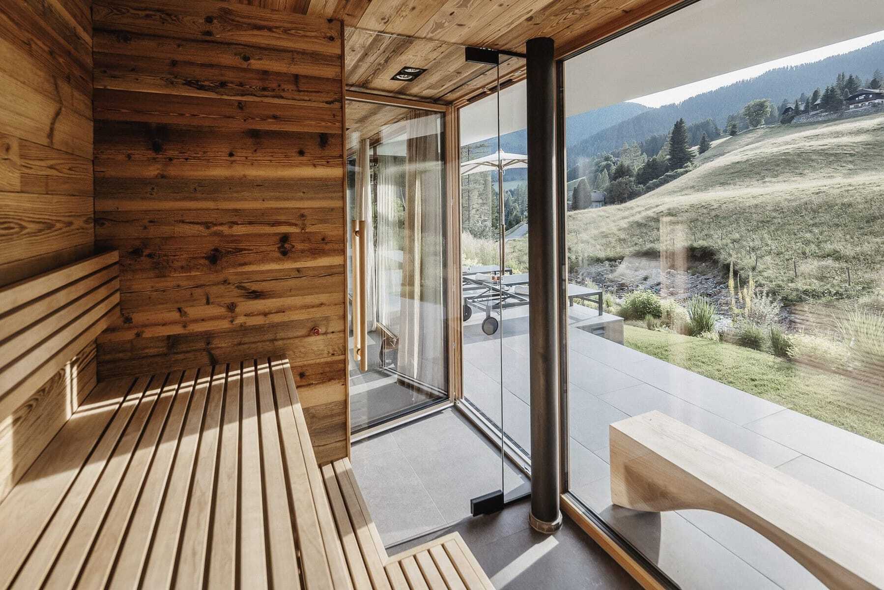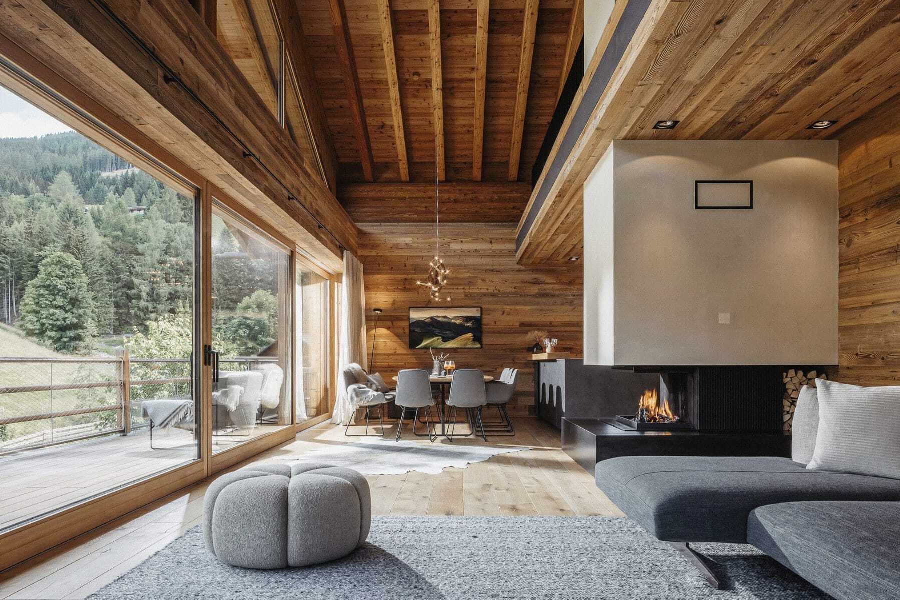 Eine Minute noch, denke ich mir, aber die Sprudelliege im 33 Grad warmen Außenpool, der auf der Terrasse eingelassen ist, ist nicht so leicht zu verlassen. Doch mich zieht es in die Lounge. Sie nimmt fast die gesamte erste Etage ein. Ein offener Raum mit Designküche, großem Esstisch, knisterndem Kaminfeuer, Sofas und stylischen Loungemöbeln. Umlaufender Balkon, dazu eine gigantische Glasfront von 11,5 Metern Länge, die sich bis unter den Dachstuhl zieht. Dieser Ausblick, einfach überwältigend!