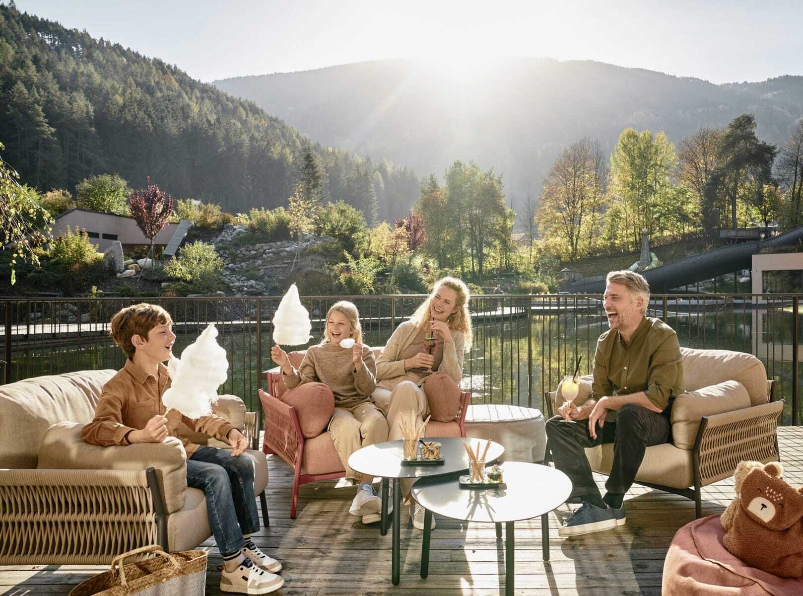 Vanilleduft beim Betreten des Falkensteiner Family Resort legt im Kopf sofort einen Schalter um: Urlaub! Gäste, klein und groß, spazieren in flauschigen Hotelbademänteln in Richtung Badewelt. Der Blick in die Lobby verheißt, was das Areal des Familienhotels bestätigt: Hier kommen Kinder und Eltern auf ihre Kosten. Das Interieur erfüllt höchste Design-Ansprüche und ist gleichzeitig kindgerecht. Wohnliche Schaukeln hängen von der Decke. Hochwertige Sessel fügen sich zu einem vielfarbigen Karussell.