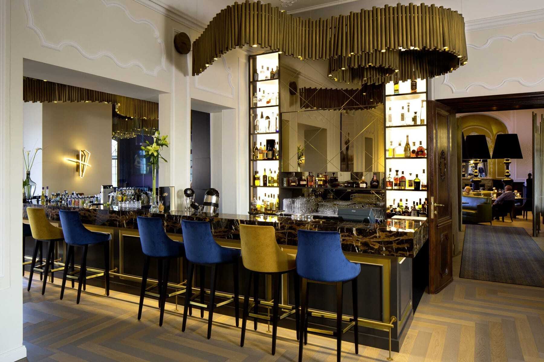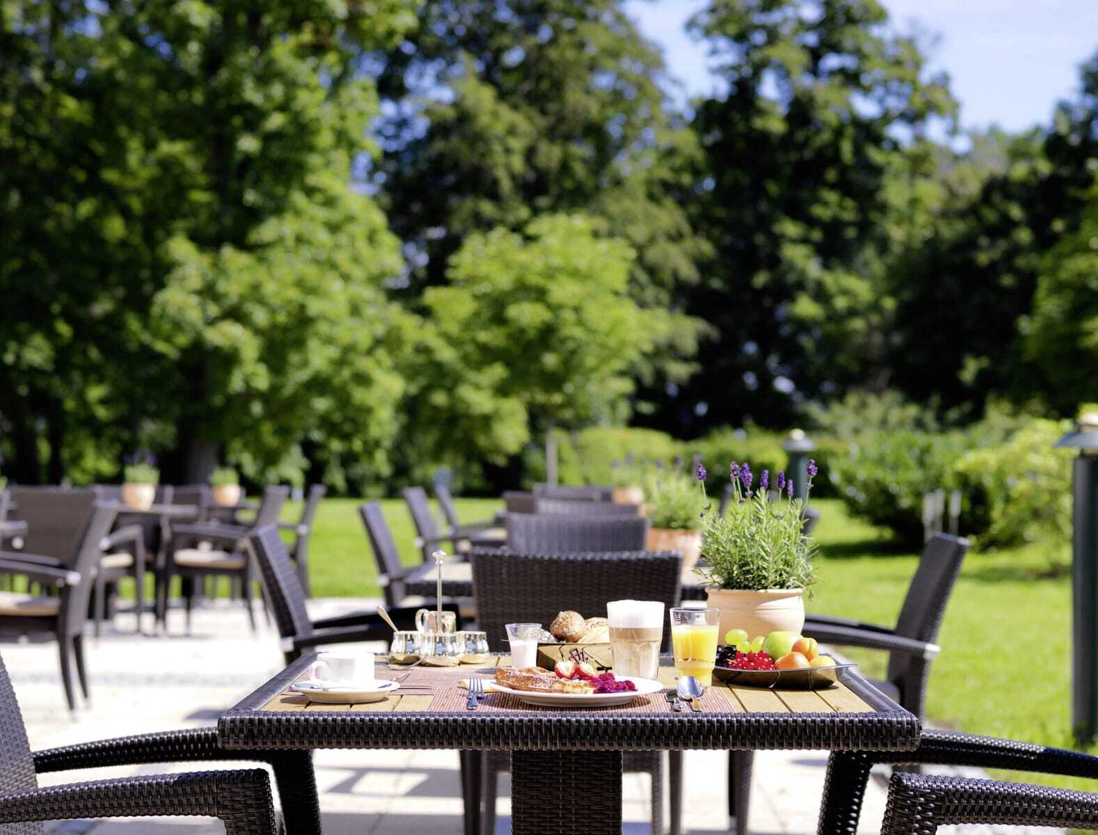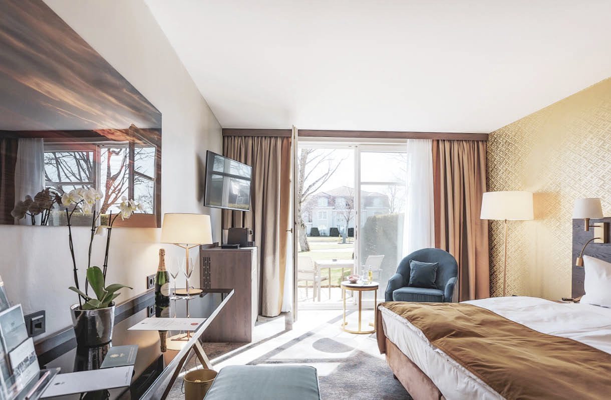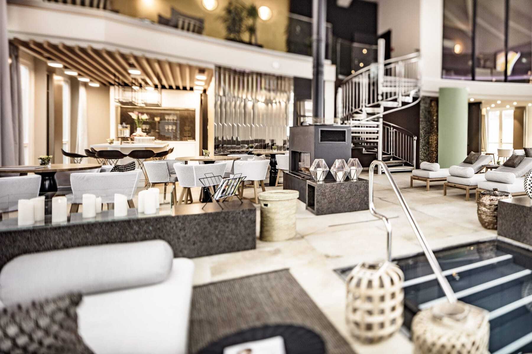 Ein weiterer ist der Blick auf den Schlosspark und den Golfplatz, der sich von der großzügigen Terrasse der »Orangerie« öffnet. Der nächste vom Outdoor-Holzdeck des 2.500-Quadratmeter-Spas. Schuhe aus für die Bodenhaftung, innehalten für den Anblick des in der Sonne glitzernden Pools und dann eintauchen in das 28 Grad warme Wasser. Ein Teil der Saunen, wie etwa die Biosauna, sind im Spa-Außenbereich angelegt, andere wie die in Deutschland einzigartige Sauerstoffsauna, im Innenbereich, wo sich die Ästhetik fortsetzt. Die Spa-Lounge mit Kamin, hohem Dach, Blick durch die bodentiefen Bogenfenster ins Grüne, der mediterrane Steinboden, die gepolsterten Liegen: Das alles erinnert an ein schmuckes Landhaus.