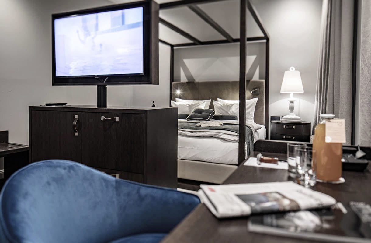 Deluxe Suite im Schloss Fleesensee mit terrakoattafarbenen Vorhängen und rostrotem Bettüberwurf
