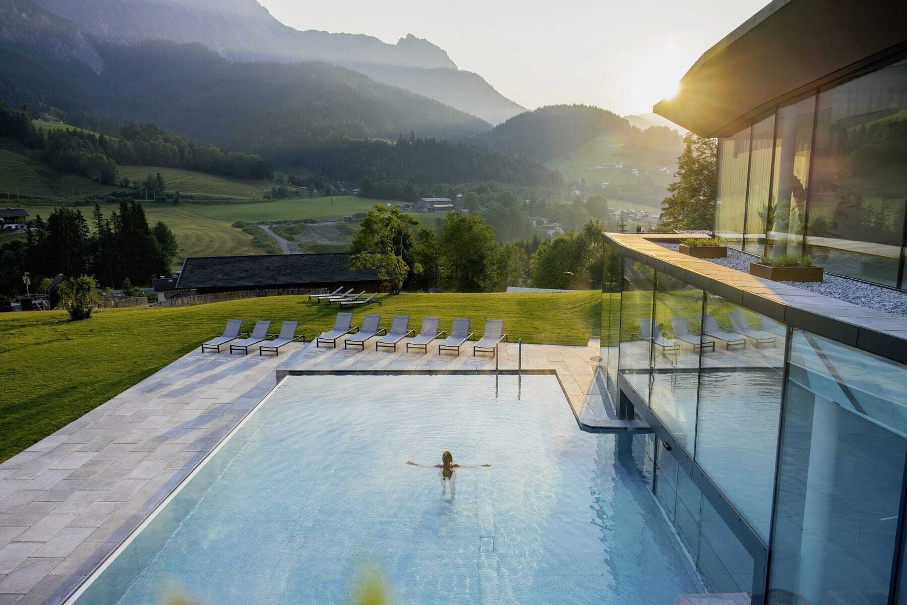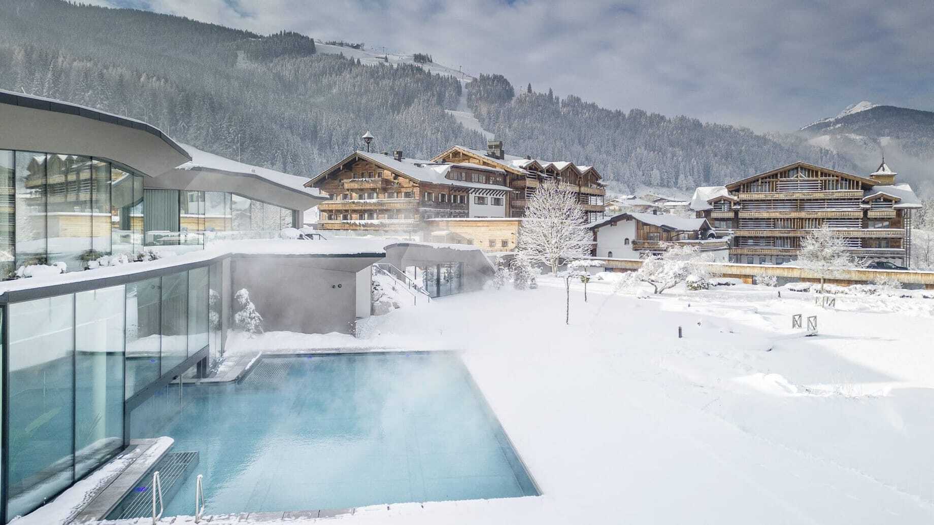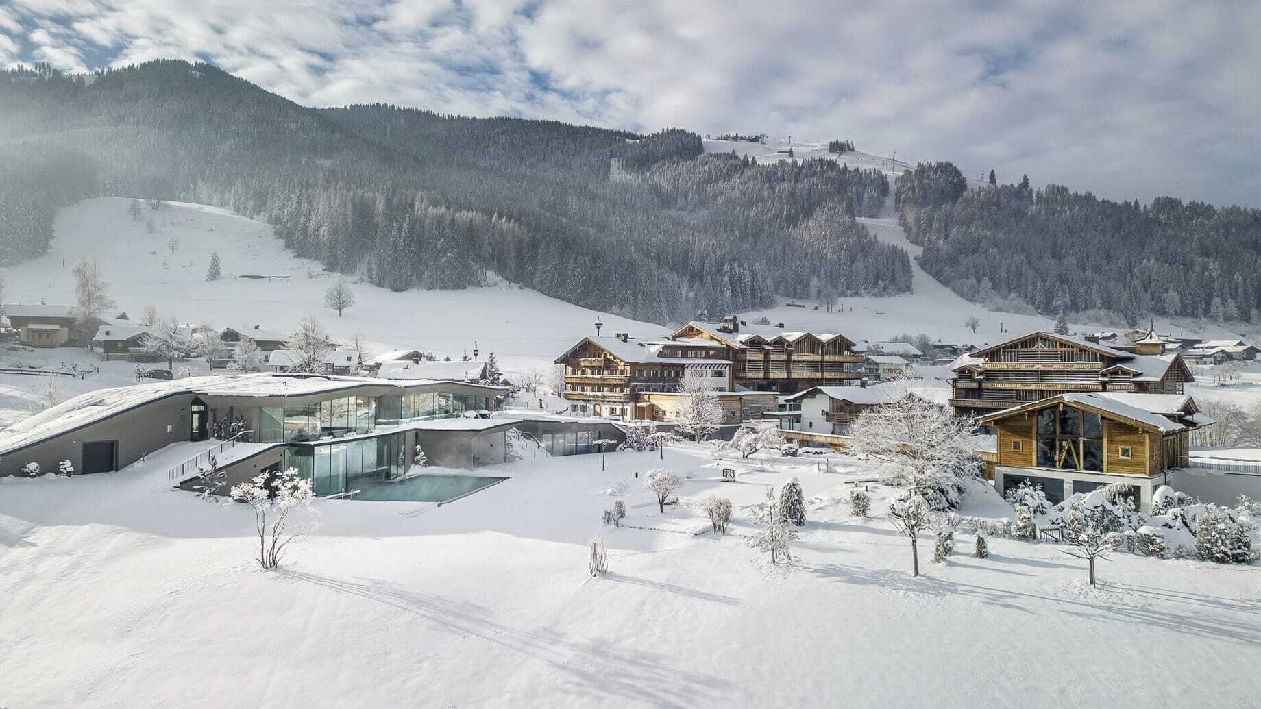 Das luxuriöse Vier-Sterne-Superior-Hotel und Chaletdorf in der Leoganger Bergwelt mit Ski In/Ski Out glänzt mit seinem Aktivprogramm für die ganze Familie. Die Chalets gruppieren sich um einen Bio-Schwimmteich inmitten des Resorts. Absolute Highlights sind der Bio-Bauernhof und das haubengekrönte Restaurant »ESS:ENZ«.