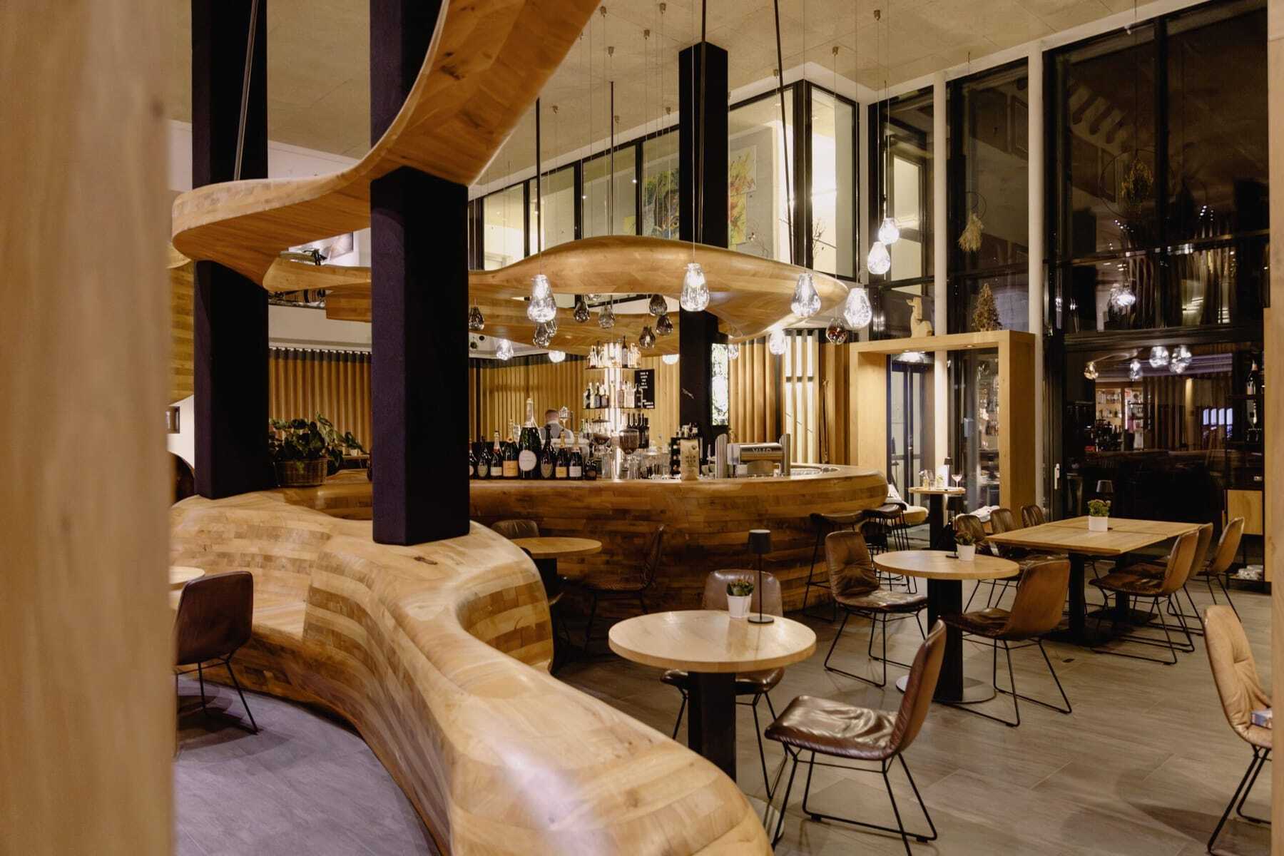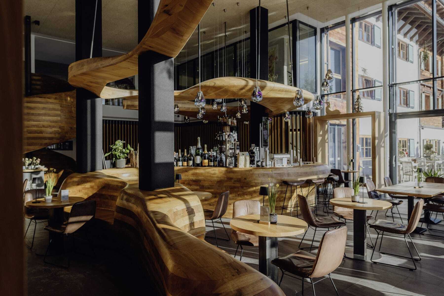 • die Bar »FREIRAUM«, ein Gesamtkunstwerk aus 16.000 Eichenholzwürfeln, ausgezeichnet mit drei Design-Awards