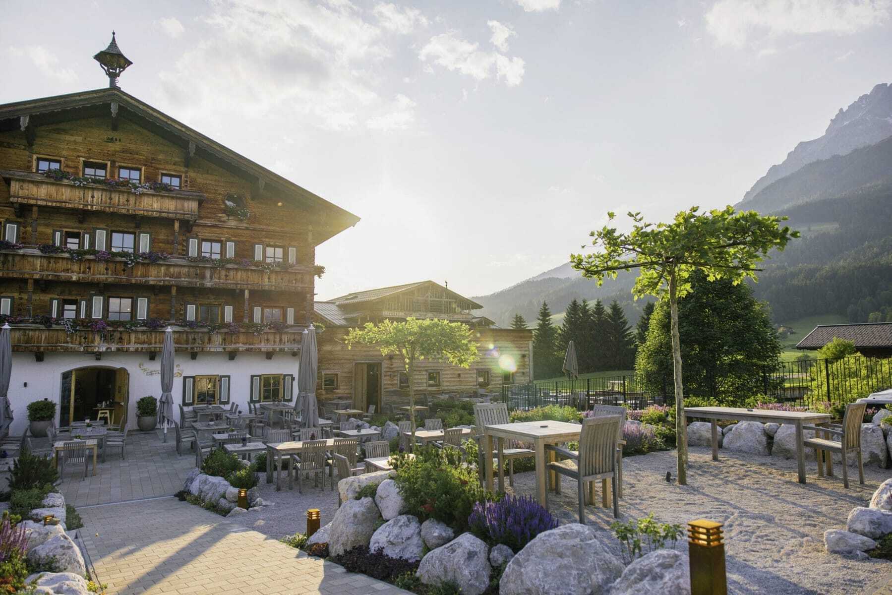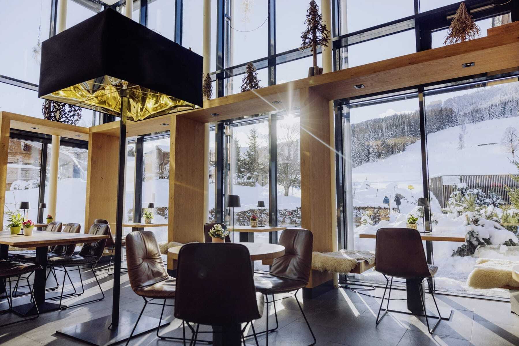 Chaletgäste erleben hier die totale Freiheit, denn sie können auch die Annehmlichkeiten des dazugehörigen Designhotels genießen. Wer die vollausgestattete Küche im Chalet mal nicht nutzen will, hat mehrere Möglichkeiten: Essen und Getränke bequem von der Chaletspeisekarte liefern lassen (ein Frühstückskorb mit vielen eigenen Produkten aus dem Biohof wird jeden Morgen geliefert), in der Bar einen Tisch reservieren. Eine köstliche Nachmittagsjause im Hotel sorgt zwischendurch für Genuss. Oder sich beim Frontcooking im dazugehörigen Gourmetrestaurant »ESS:ENZ«, das mit zwei Hauben ausgezeichnet ist, verwöhnen lassen.