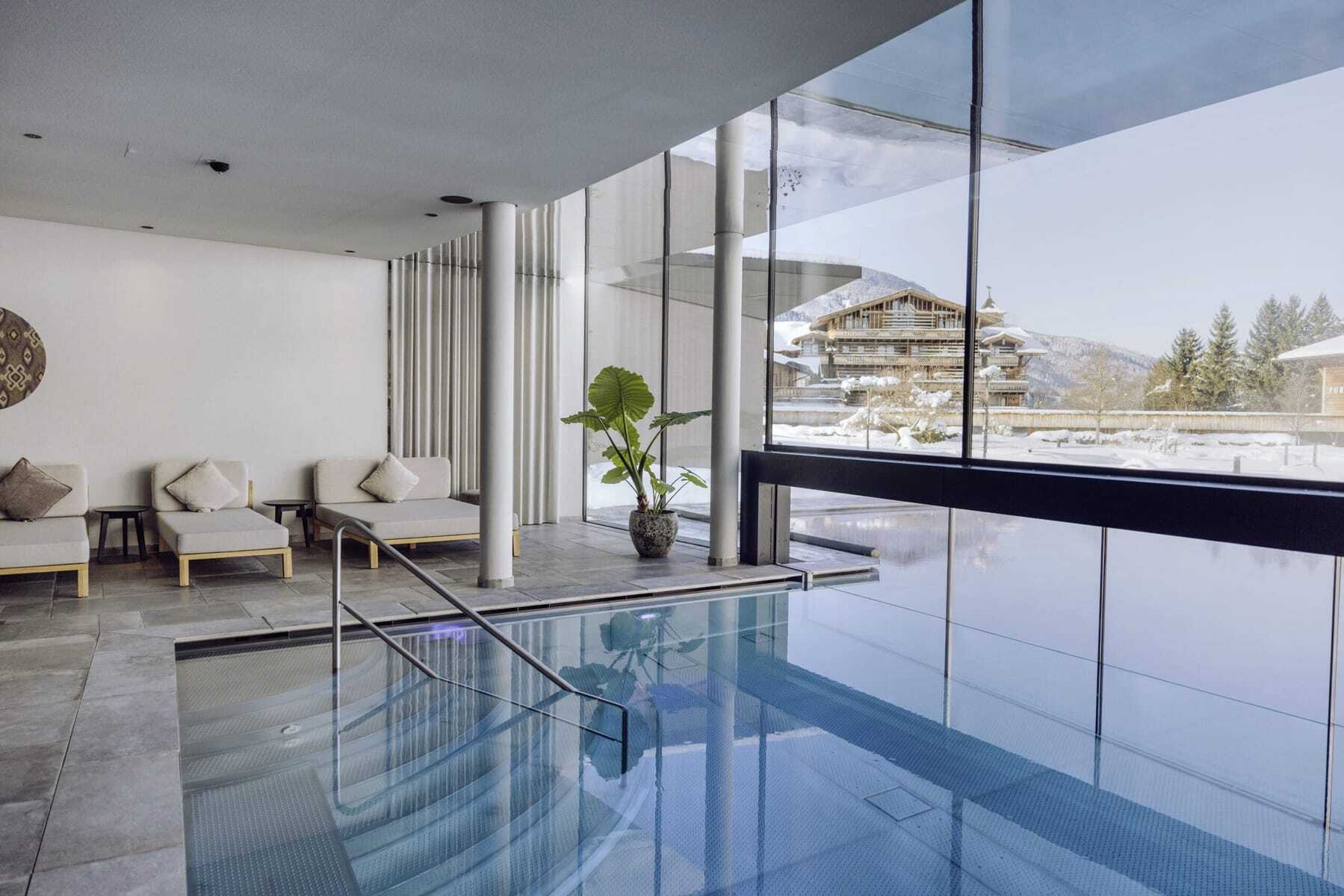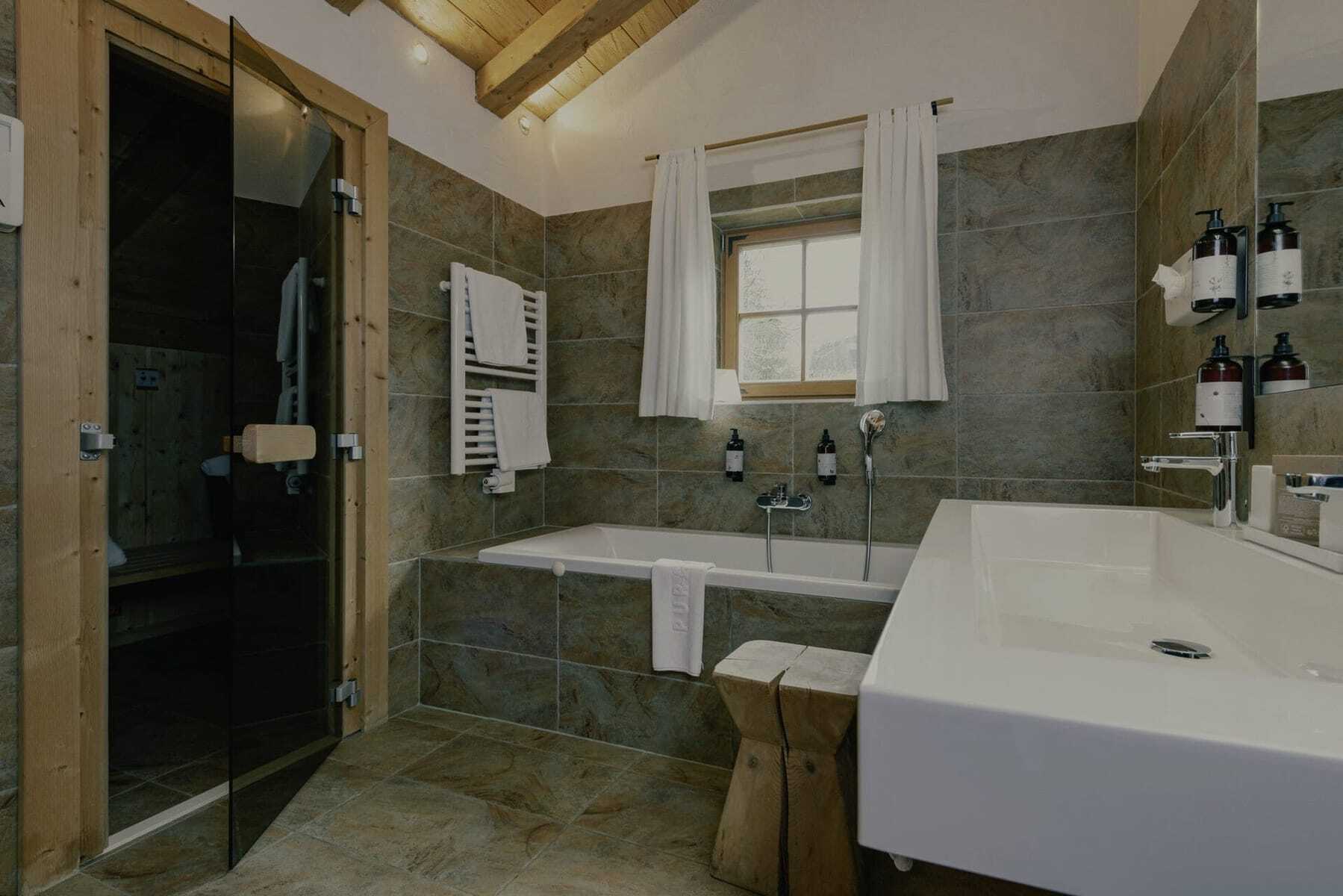 Gleiches gilt für den Wellnessbereich: Zwar verfügen alle Chalets über eine Finnische Sauna, Infrarotkabine und Erlebnisdusche, doch das freistehende »Badhaus« aus Holz mit seinen vier Panoramasaunen und dem Naturbadeteich mit Bergblick ist mehr als nur einen Besuch wert. Zusätzlich lockt der »Heaven-Spa« mit spektakulärem Outdoor-Infinitypool. Kinder können sich derweil im Indoorspielraum mit Kletterwand oder auf dem Outdoor-Abenteuerspielplatz austoben und im Stall des Bauernhofes Hasen, Zwergziegen und Schafe streicheln. Und dabei das eigene Frühstücksei aus dem Hühnernest stibitzen.