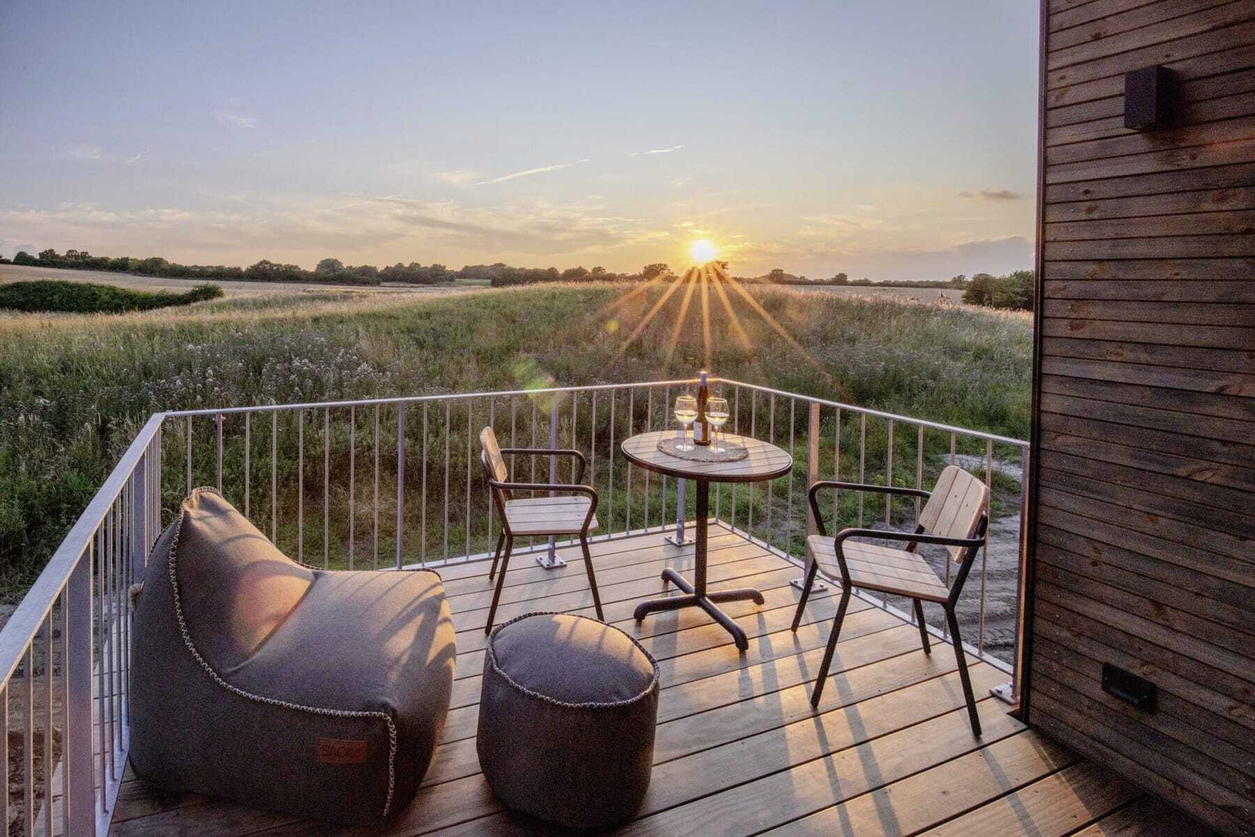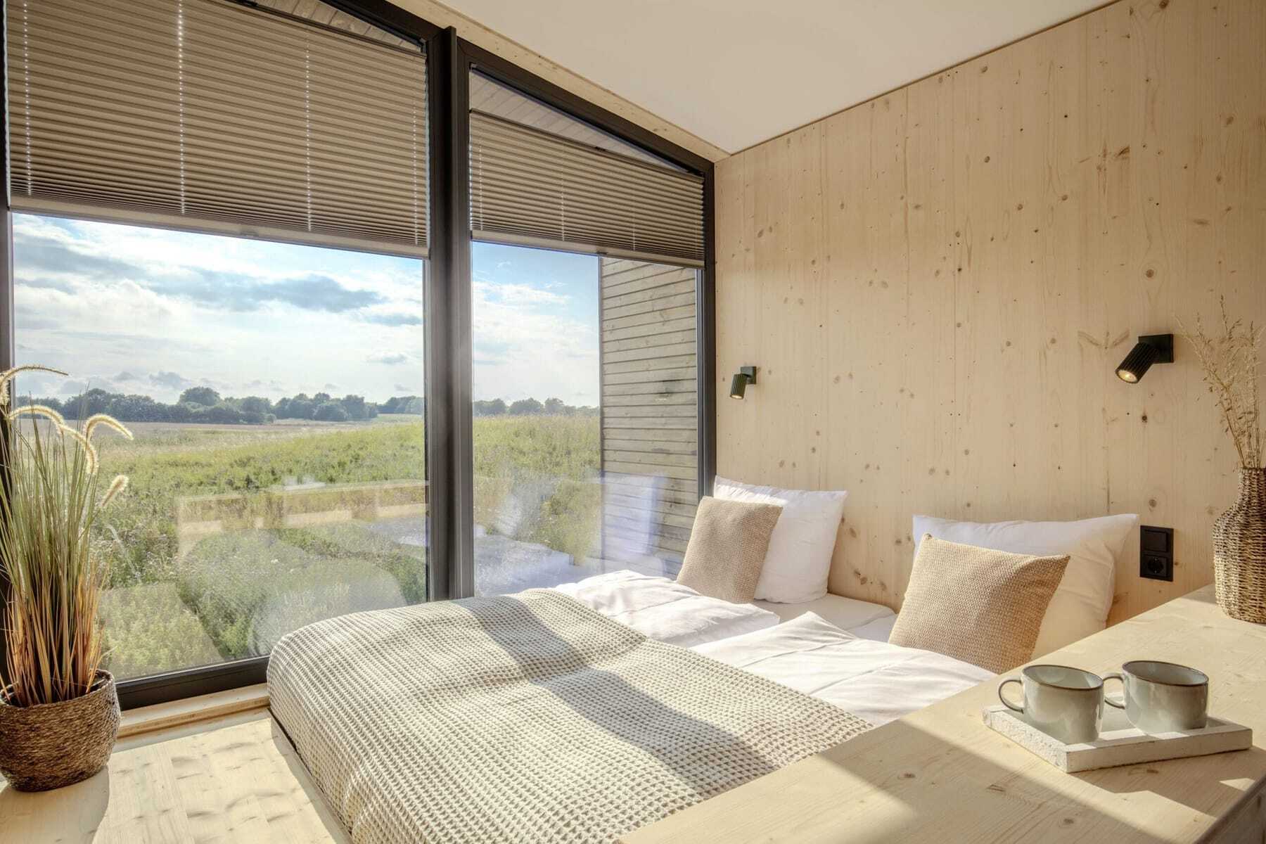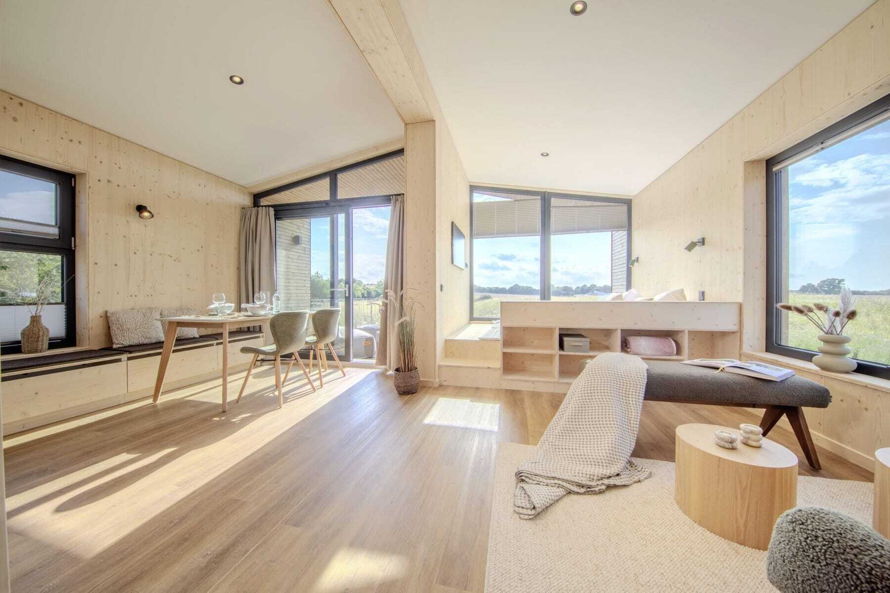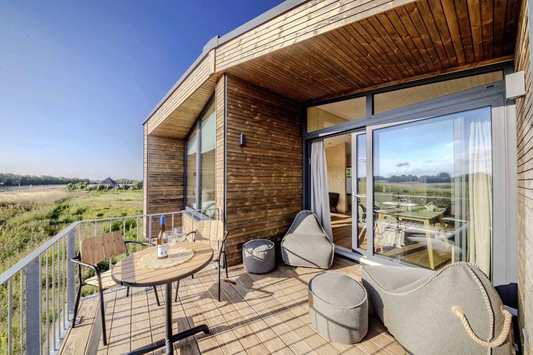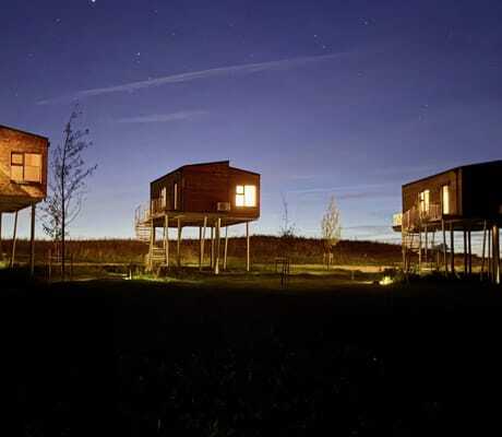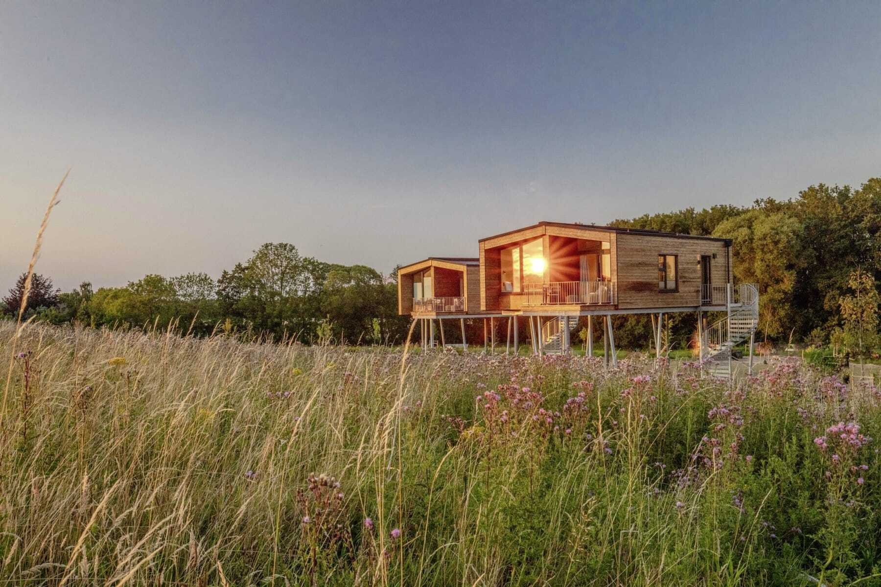 Das »Aber hier ist doch nix!« mancher Skeptiker lässt sie lächeln, denn genau das »Nix« ist ihr USP. Und so sehen das auch die Gäste, die von Anfang an das ungewöhnliche, zweieinhalb Kilometer von der Ostsee entfernte Hotel auf Stelzen nahezu stürmten. Natur pur auf 25 Hektar Landschaftsschutzgebiet, Wiesen, die nur zweimal im Jahr gemäht werden dürfen, ein Streuobstgarten mit alten Sorten, ein Teich, an dem Frösche quaken, und eine Weide, auf der zottelige Galloway-Rinder grasen. Darin harmonisch eingebunden die aus heimischen Hölzern erbauten Lodges und Lofts, die auf sechs Meter hohen Stahlkonstruktionen thronen und so fast ein wenig futuristisch anmuten.