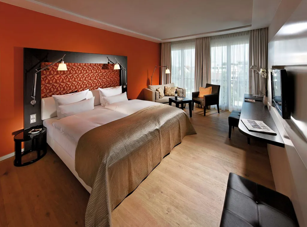 Zur kleinen, feinen Private Hotel Collection der Brauereifamilie Scheidtweiler gehörend, ist das Parkhotel Stuttgart trotz seiner modernen Architektur und Größe ein Hotel, das Charme und Esprit ausstrahlt und in dem viel Wert auf Individualität gelegt wird. Hier verweist der großformatige, schwarz-weiß-gestreifte Popo eines Zebras auf den nahen Zoologisch-Botanischen Garten Wilhelma, dort ein historisches Plakat auf die frühere Sauerkrautfabrik am Hotelstandort. Hier leuchtet ein pinkes Sofa im Foyer, dort lockt eine schnieke, kleine Saunalandschaft zum Ausspannen über den Dächern von Echterdingen.