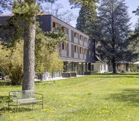 Einfach ankommen – und der Stille lauschen. Das ist der erste Eindruck, wenn man das Seegut Zeppelin in Friedrichshafen-Fischbach betritt. Auf dem vier Hektar großen Areal mit seinem riesigen Naturpark und direktem Zugang zum Bodensee mit eigenem Strand scheint die Zeit langsamer zu vergehen. Automatisch nimmt man als Gast Geschwindigkeit raus. Hier hat Familie Fennel einen Ort geschaffen, an dem Ruhe, Natur und Design zu einem stimmigen Ganzen verschmelzen. Im Zentrum der Anlage steht die denkmalgeschützte Villa Gminder aus dem Jahr 1908, flankiert von vier modernen Neubauten in Holz-Beton-Hybridbauweise. Sie fügen sich mit ihren dunklen Fassaden harmonisch in die Landschaft ein und beherbergen 62 Zimmer, ein Restaurant, Spa und acht Seminarräume. Die Architektur ist reduziert, die Ausstattung hochwertig und bewusst natürlich gehalten – Eiche, Leinen, Kalkputz und Naturstein sorgen für eine kontemplative Atmosphäre.