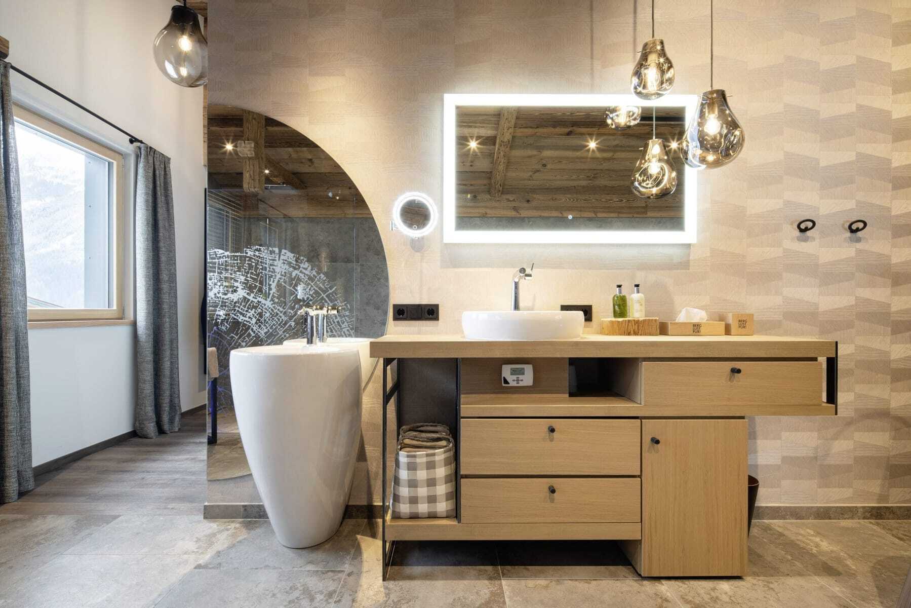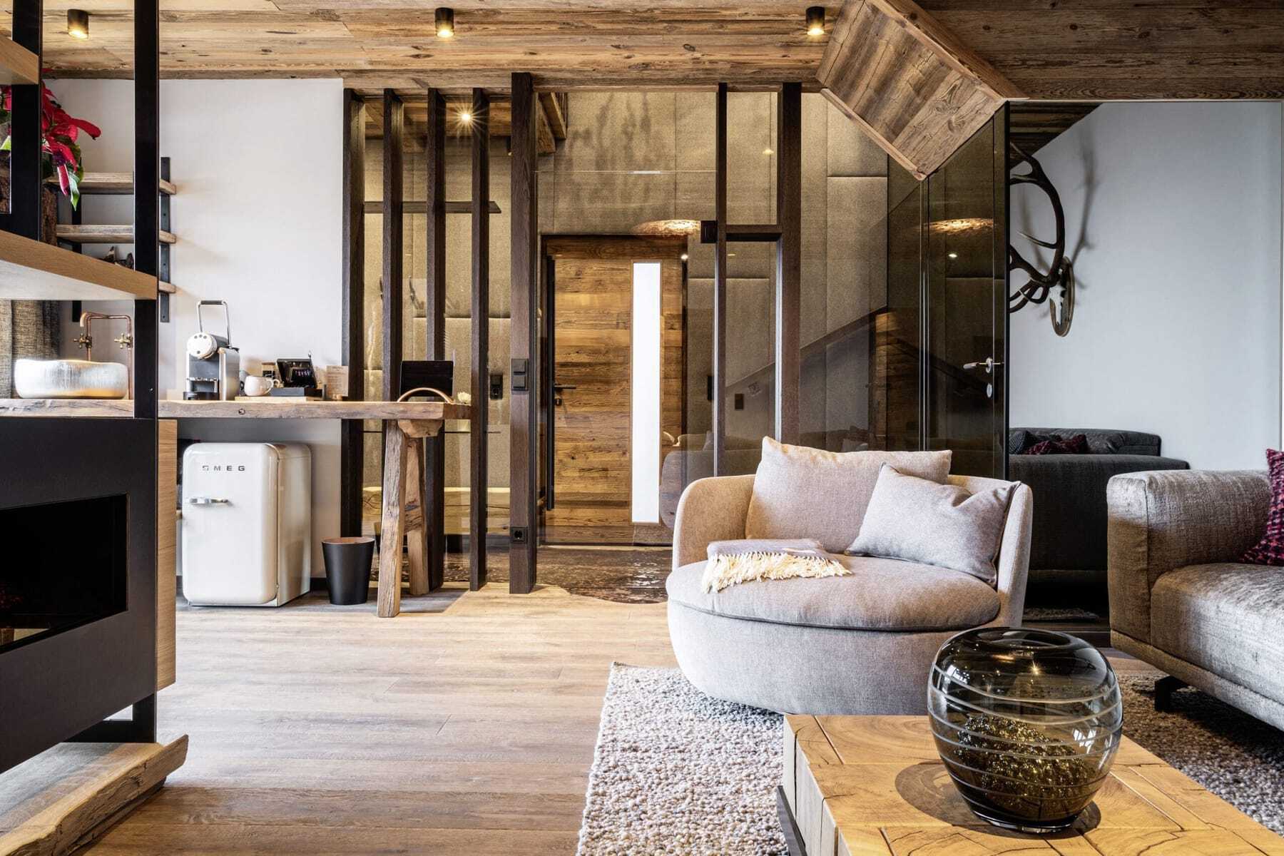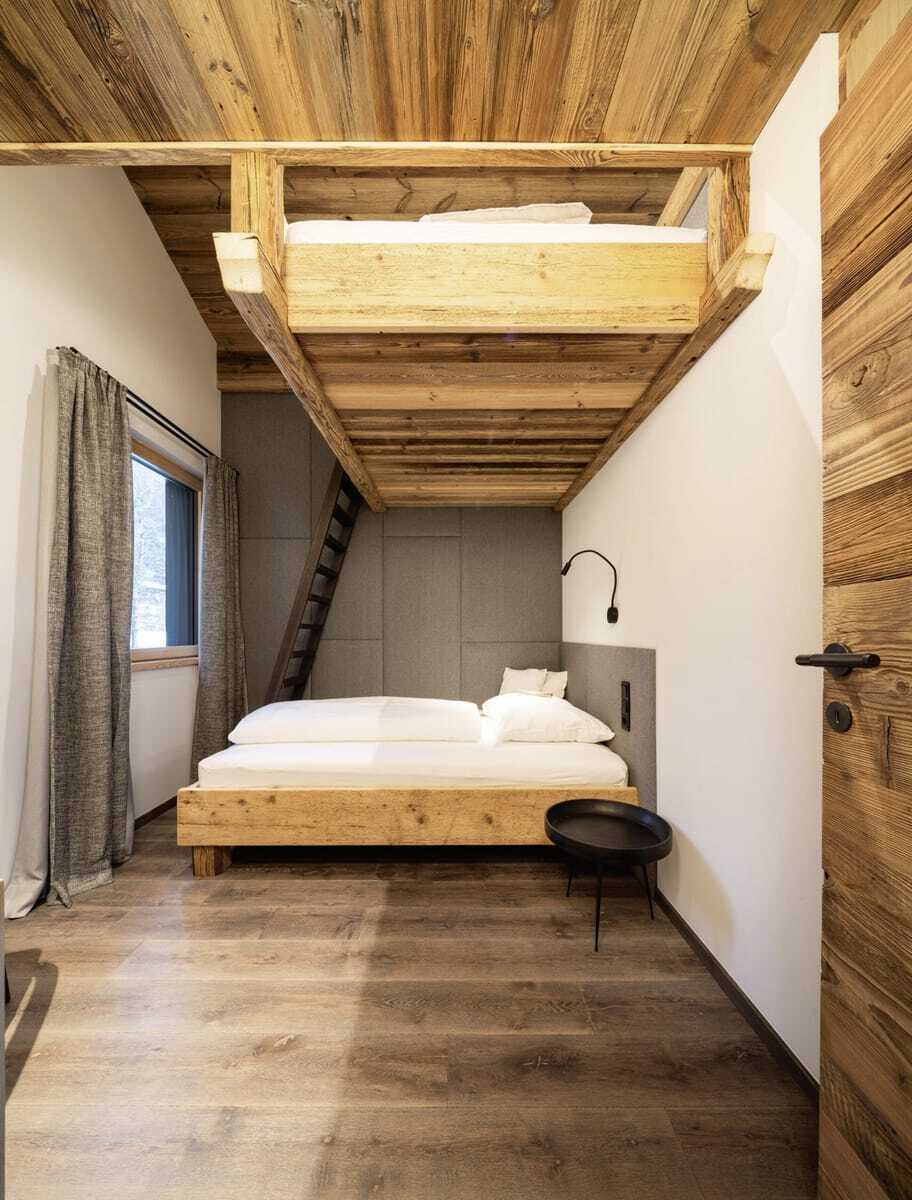 Das Gefühl von Weite und Freiheit dominiert auch im Inneren. Alle Räume sind offen, lichtdurchflutet und in modernem Alpin-Stil gestaltet. Vor dem Wohnzimmer ein riesiger Sonnenbalkon mit Hängeschaukel und Wärmestrahlern. Auch das Badezimmer mit Infrarotliegen ist außergewöhnlich großzügig und ohne Türe. Doch es gibt eine Türe – zum Kinderzimmer mit Ausblick auf die Wildtierfütterung. Diese ist eines der Steckenpferde von Gastgeber, Küchenchef und Jäger Hans-Peter Gassner.