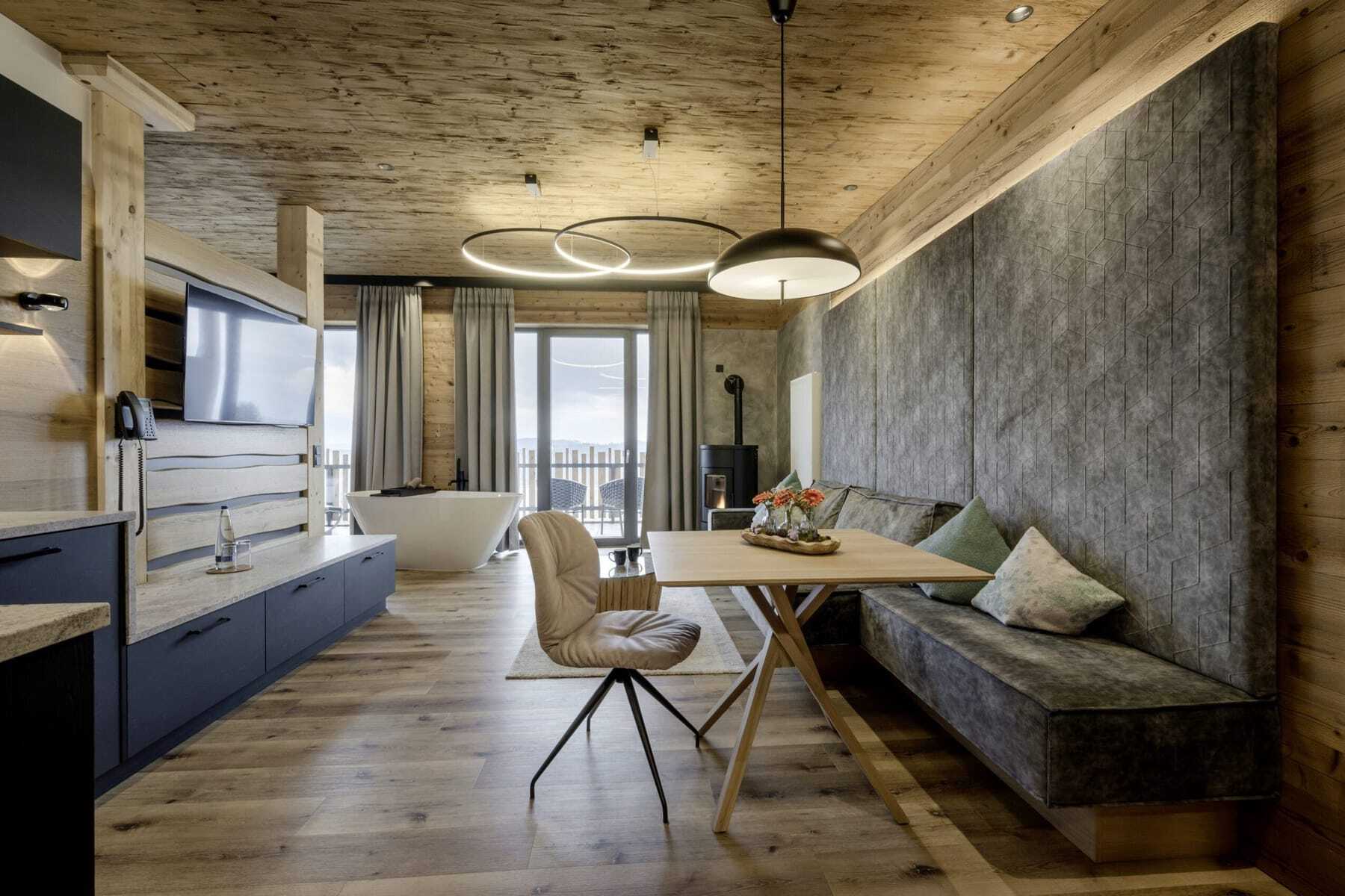 Die sechs neuen, sich in den Hang schmiegenden Erdhäuser bieten ebenso wie die beiden Holz-Cottages und die neun Lofts Raum und Ruhe für Paare oder Familien mit Hund, die Wert auf besonderen Komfort und Privatsphäre legen. Die Cottages sind nachhaltig gebaut mit Außenwänden aus gehackter, naturbelassener Lärche und im Inneren mit einem gemütlichem Mix aus modernen und rustikalen Stilelementen gestaltet. Auch die Erdhäuser zeigen reichlich naturbelassenes Holz und regionalen Granit, mit zeitlos schönem Interior Design in dunklen Grau- und Naturtönen. Cottages wie Erdhäuser sind mit getrenntem Wohn-Schlafbereich, Pellets-Ofen, BARF-Küche, Sauna und Hot Whirlpool ausgestattet – eine perfekte eigene kleine Urlaubswelt.