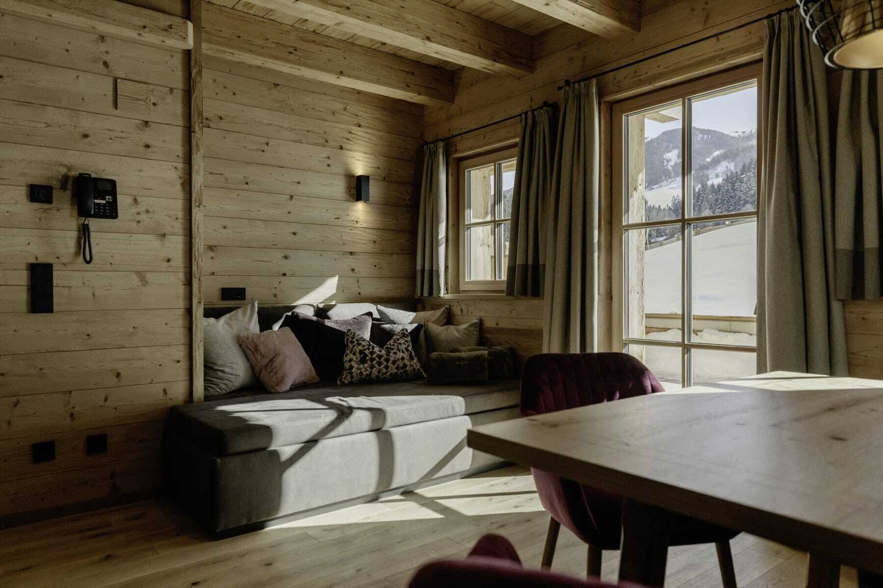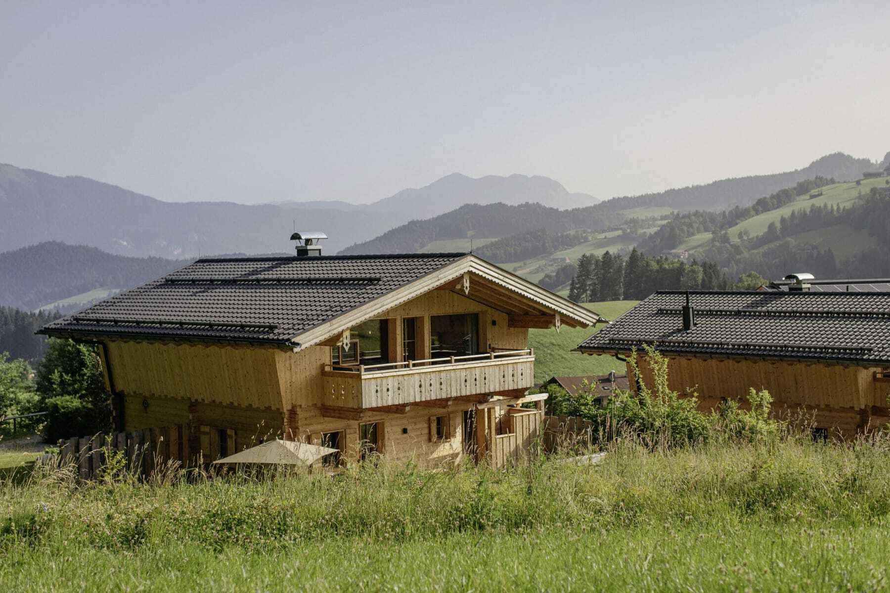 Nachdem man das Inntal und jeglichen Straßenverkehr hinter sich gelassen hat, eröffnet sich oberhalb des ruhigen Orts Hygna in Alleinlage das Chaletdorf mit seinen elf Häusern plus Haupthaus – inmitten einer unglaublich satten Natur, wie sie nur Tirol zu bieten hat. Wir staunen nicht schlecht, als sich das Tor öffnet, und werden direkt im Haupthaus von Sarah an der Rezeption erwartet. Sie ist genauso nett und entgegenkommend wie in ihren E-Mails zuvor.
