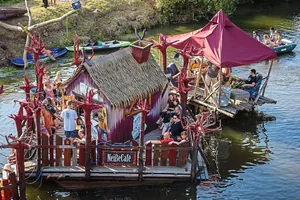 Im Reich der Turiseder geht es ums Spielen, das ist Gesetz und gilt für Kinder wie Erwachsene. Was nicht schwerfällt, überall wird die Fantasie angeregt. Das beginnt schon auf dem Parkplatz direkt an einem der Tiergehege. Dort läuft tatsächlich ein Kamel namens Carlos umher. Weil ein Tagesausflug bei weitem nicht reicht, in diese vergessene Welt einzutauchen, kann man auch übernachten: mittendrin, im Zelt-Hoteldorf oder ganz oben, in windschiefen Baumhäusern (ohne TV, dafür mit Geisterstunde). Die befinden sich ebenfalls direkt im Zauberreich und sind über scheinbar wackelige Holzstege zu erreichen. Vier Wipfeldomizile sind sogar den Winter über buchbar – auch für den Fall, dass ein Turiseder auf Zeitreise einen Platz zum Übernachten braucht.