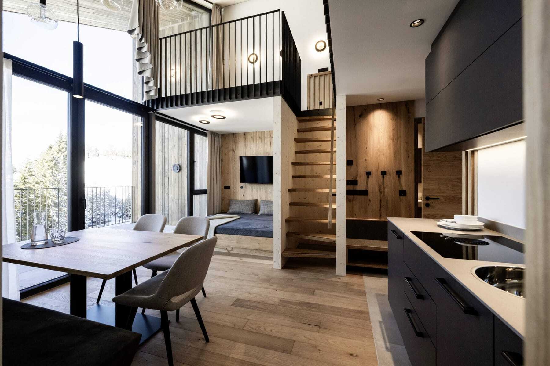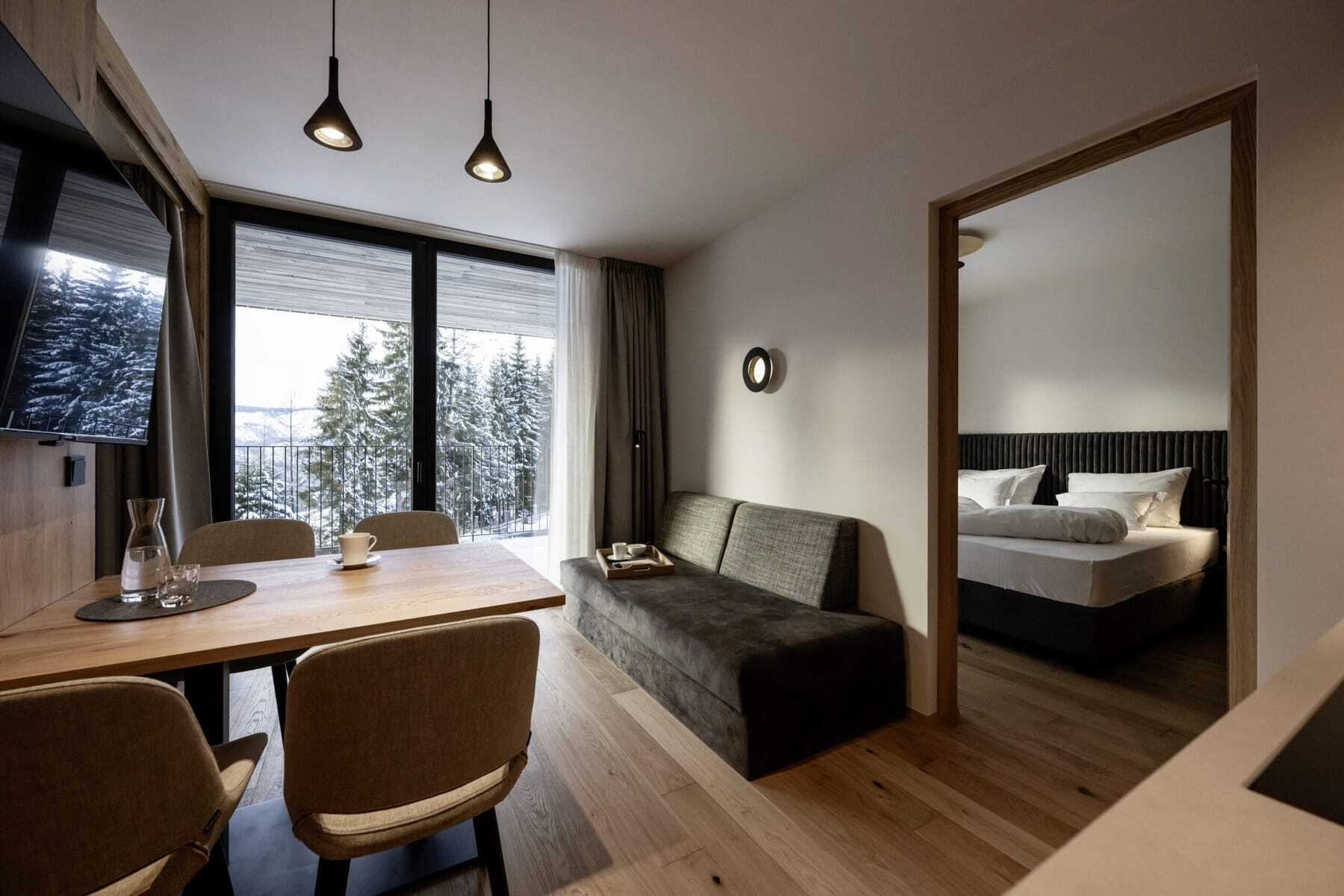 Dank dieser außergewöhnlichen Lage genießen die Gäste des Adventure Family Hotel Maria sommers wie winters den ganzen Tag Sonne, im August sogar bis halb zehn Uhr abends. Und das nicht nur von der Sonnenterrasse aus, sondern aus allen Hotelzimmern – und ganz besonders aus den neuen Eco Lodges. Umweltbewusst und wohngesund aus massivem Vollholz erbaut, bieten die zehn modernen Appartements stilvolles Wohnen mit bodentiefen Glasfenstern und jeweils großzügiger Panorama-Loggia.