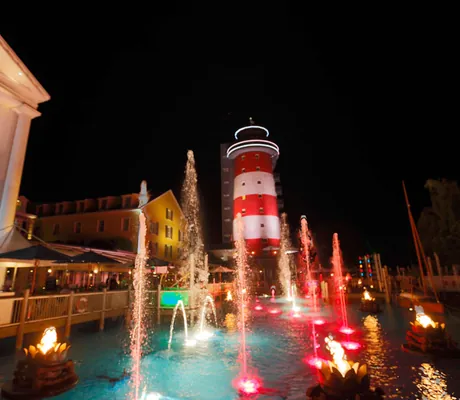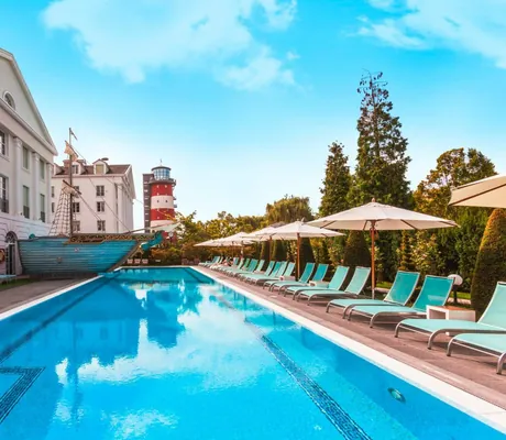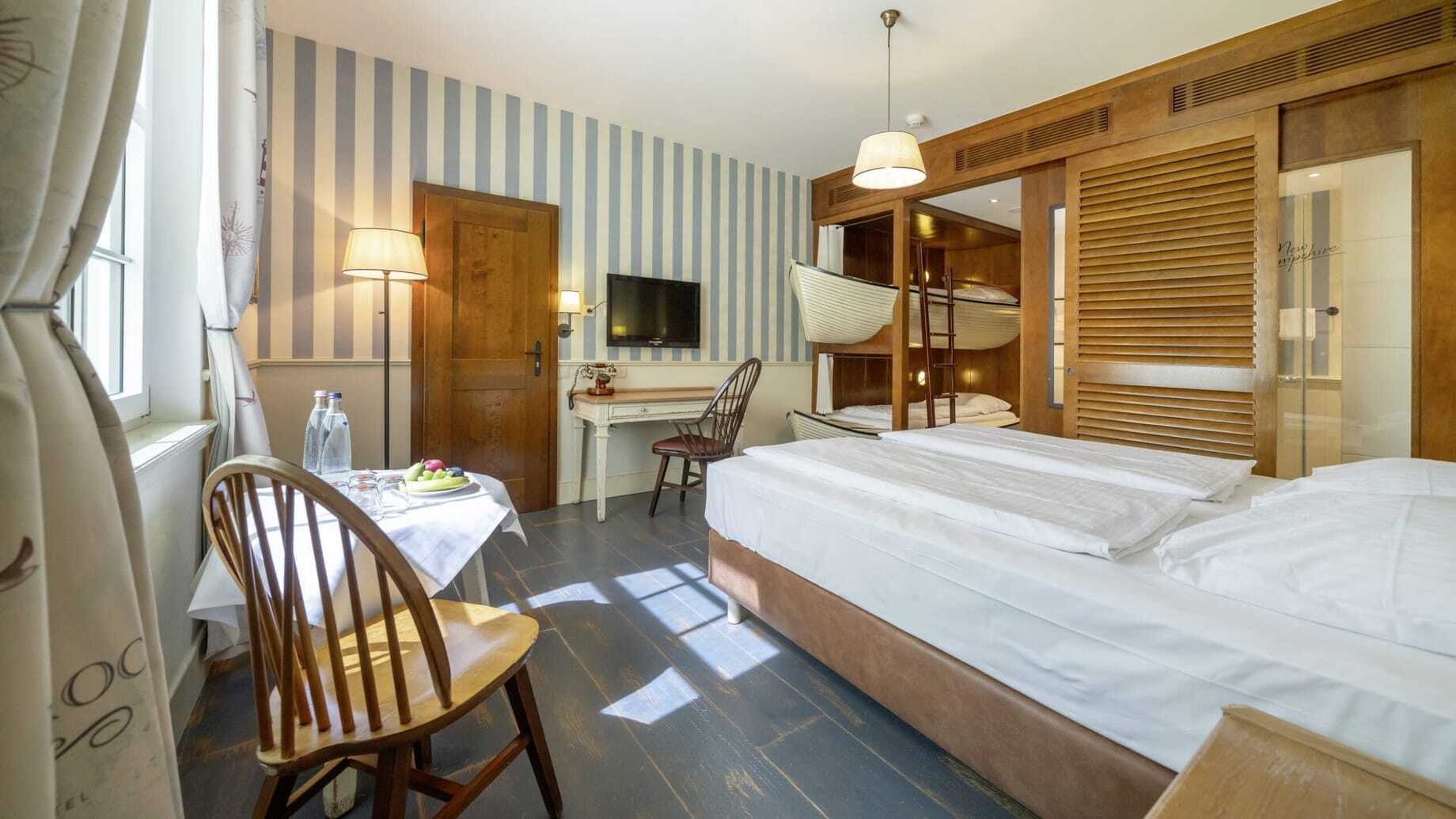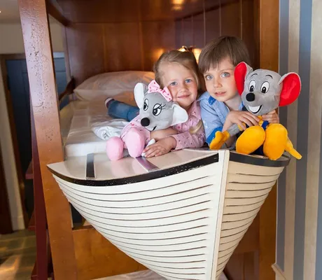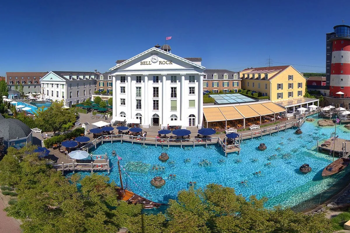 Ebenfalls ein Renner, vor allem bei den Kleineren: die Piratenschatzjagd im Hotel »Bell Rock«. Dieses Hotel, dessen mächtiger neoklassizistischer Hauptbau mit den weißen Säulen ebenso gut in Neu-England stehen könnte, lädt Groß und Klein zu einer Entdeckerreise ins Land der Pilgerväter ein. Mit einem rot-weiß geringelten Leuchtturm und einem See, auf dem bunte Holzboote schaukeln. Holzbooten nachempfunden sind auch die Etagenbetten in den durchdachten Familienzimmern, und wie in einem riesigen Schiffsbauch fühlt man sich im Restaurant. Hier hängen Ölfässer von der Decke und jede Menge Nemos tummeln sich in einem Aquarium. Wem das Essen der Großen zu lang dauert, der kann in der Kinder-Kajüte durch eine Tube rutschen, sich an der Kletterwand hochhangeln oder Kinderkino gucken.