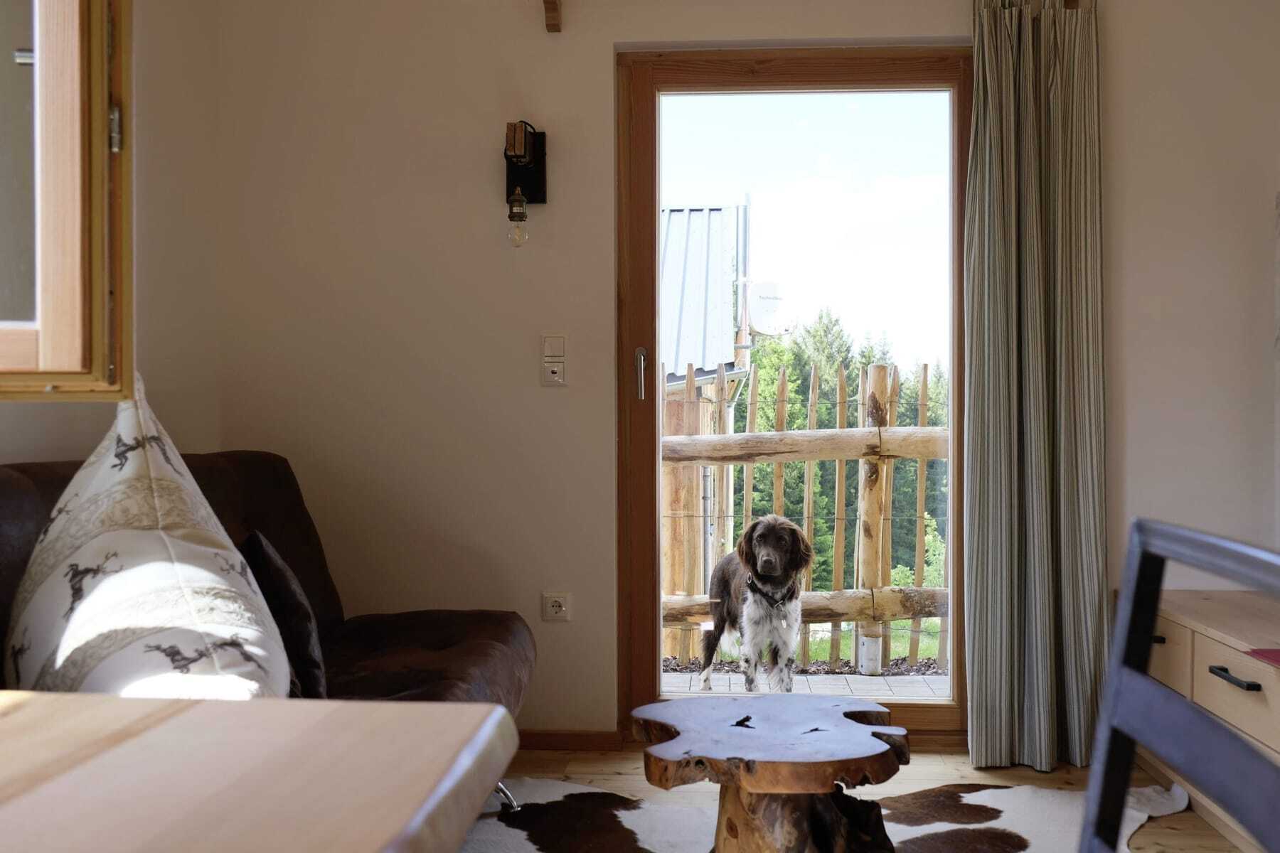 Blick in den Wohnraum des Cottages im Hunderesort Waldeck mit Kuhfellteppich