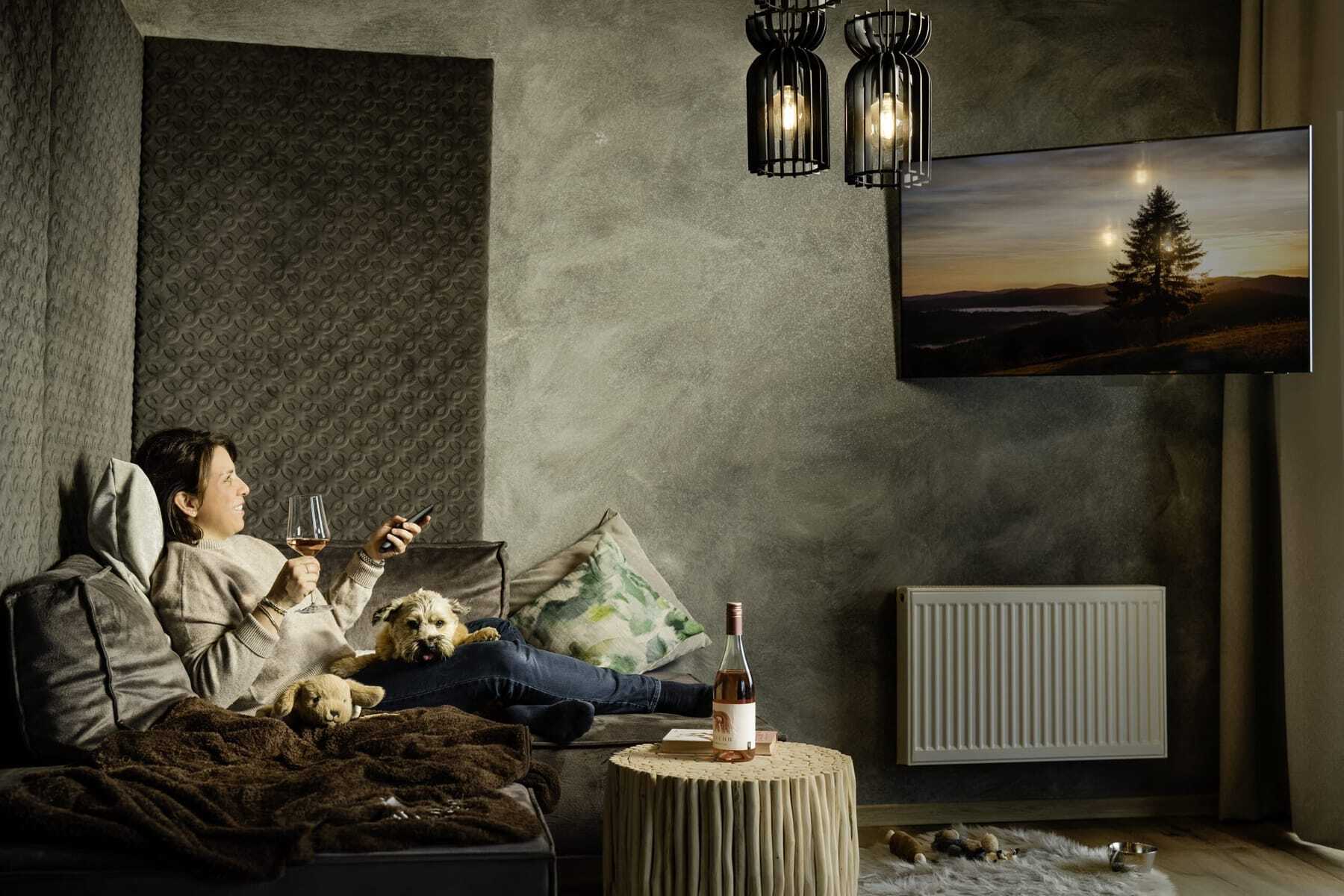 Denn wer glaubt, ein Hunderesort sei ausschließlich praktisch und quasi abwaschbar gestaltet, der irrt. Geschmackvoll und edel, mit viel einheimischem Holz und Naturmaterialien, in ruhigen Farben gestaltet präsentiert sich das Waldeck. Neben klassischen Doppelzimmern bieten zwei Cottages, sechs Erdhäuser und neun Lofts viel Platz und Abgeschiedenheit, teils mit eigener Sauna und Hot Whirlpool. Wer stattdessen den schönen Wellnessbereich mit Infinitypool im Hotel nutzen oder sich eine Massage gönnen möchte, für den übernimmt ein eigens dafür abgestellter Mitarbeiter das Hundesitting. Denn: Ist der Hund gechillt, kann auch der Mensch in Ruhe chillen.