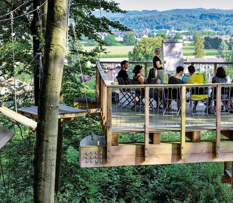 Westerham – die Akademie, der Name ist Programm. Das renommierte Haus ist ein ganz besonderer Lernort. Ohne steriles »akademisches« Ambiente, sondern aufgeschlossen, schick und up to date. Die Ruhe mitten im Grünen und der moderne Komfort schaffen ein Klima, das inspiriert und motiviert. Das gilt besonders für die acht Meter hohe Plattform mitten im Wald, ein paar Schritte nur von der Akademie entfernt. Eine Art Hochsitz, auf dem man im Rhythmus der Bäume fast zu schweben scheint – da bekommen Gedanken und Ideen tatsächlich Flügel. Dieser luftige »Gruppenraum« ist ein Erlebnis für sich. Bis zu 30 Seminarteilnehmende haben hier Platz für Gruppenarbeiten, Workshops oder intensive Gespräche. Und wer ein Teambuilding damit verknüpfen will, kann durch den Hochseilgarten sogar sportlich aufsteigen.
