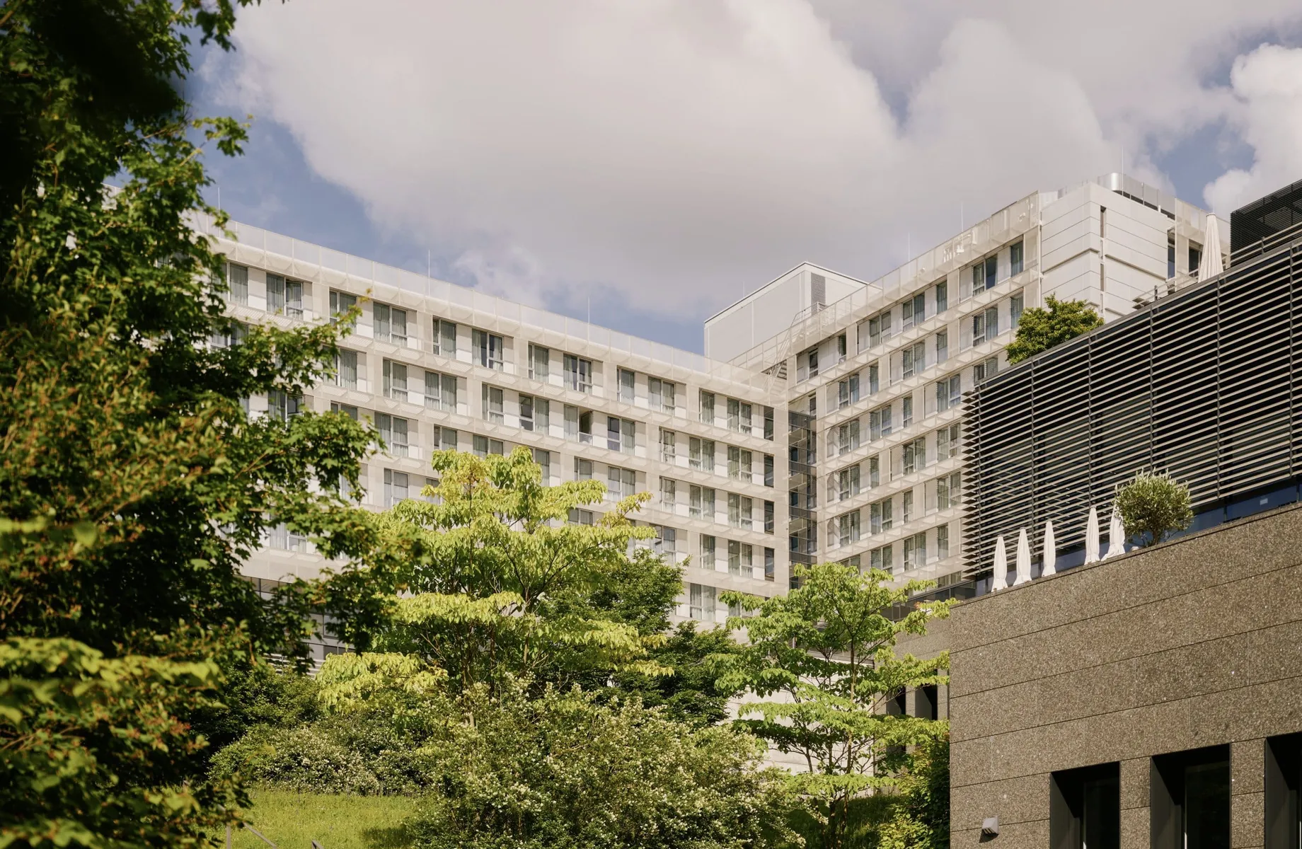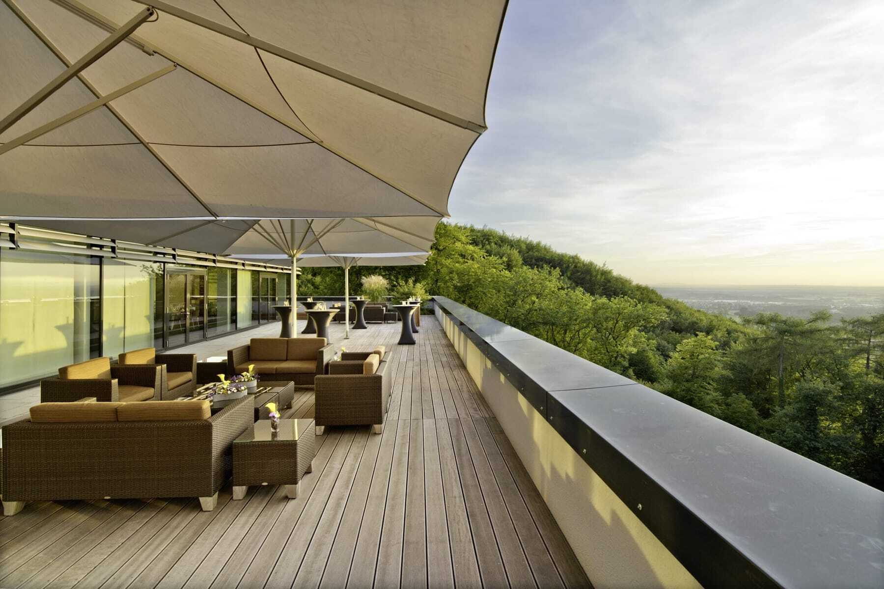 Das kommunikativ ausgelegte Restaurant sowie die schön angelegten Terrassen und weitläufigen Rasenflächen laden zu Dialog und Begegnung geradezu ein, ebenso wie die drei Bars. Egal ob zum Ausklang mit Partyflair in der Bar »Last Call« oder in typischer Upper-Class-Atmosphäre im »Upper Deck«. Inspiriert von einem klassischen Oberdeck mit exklusiven Designelementen der Lufthansa Group, bietet letzteres das perfekte Ambiente, um zu arbeiten und/oder zu entspannen. Dabei verleiht der allgegenwärtige Blick ins Grüne dem Geist Flügel. Und Flügel sind an diesem Ort ja durchaus angesagt.