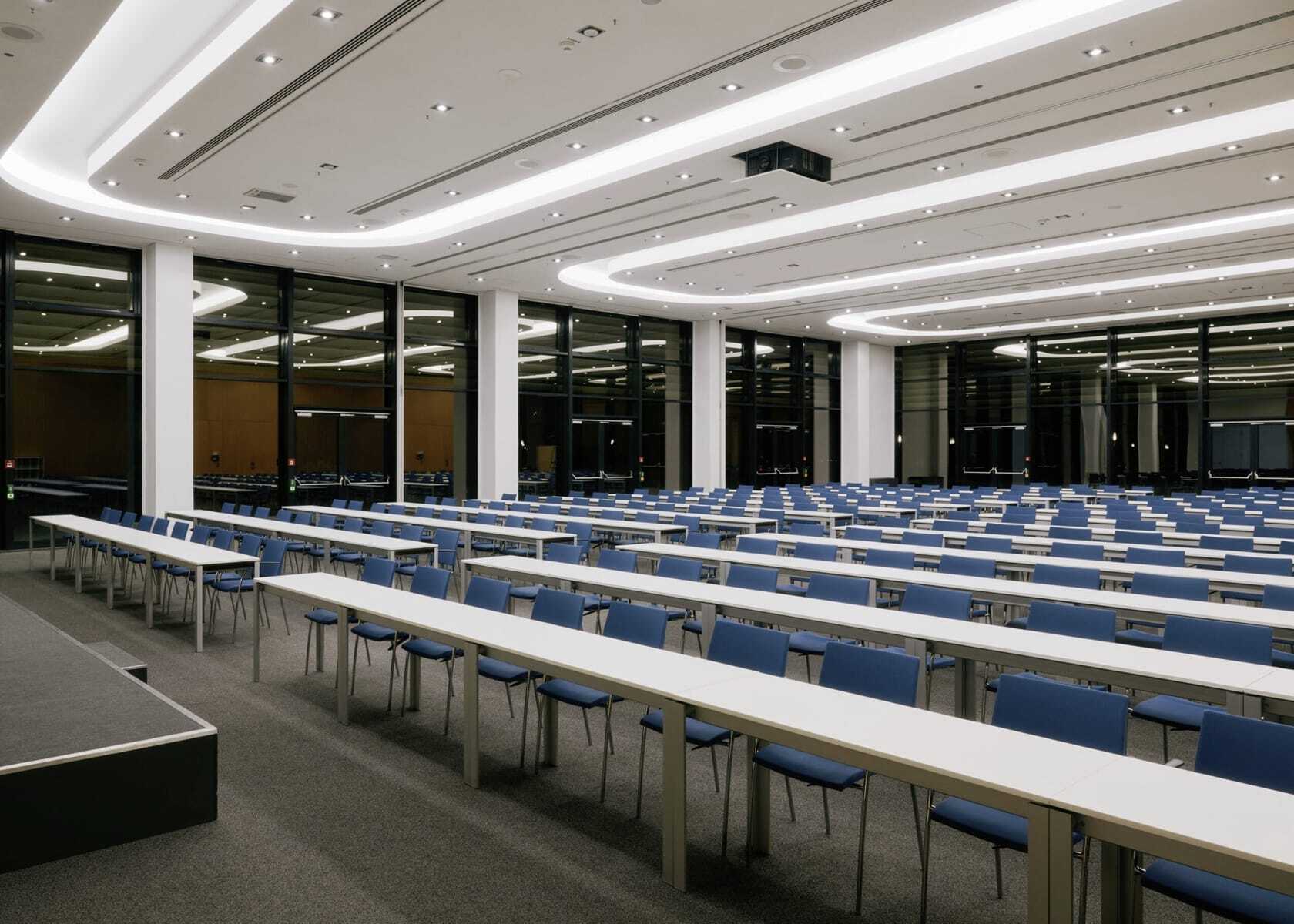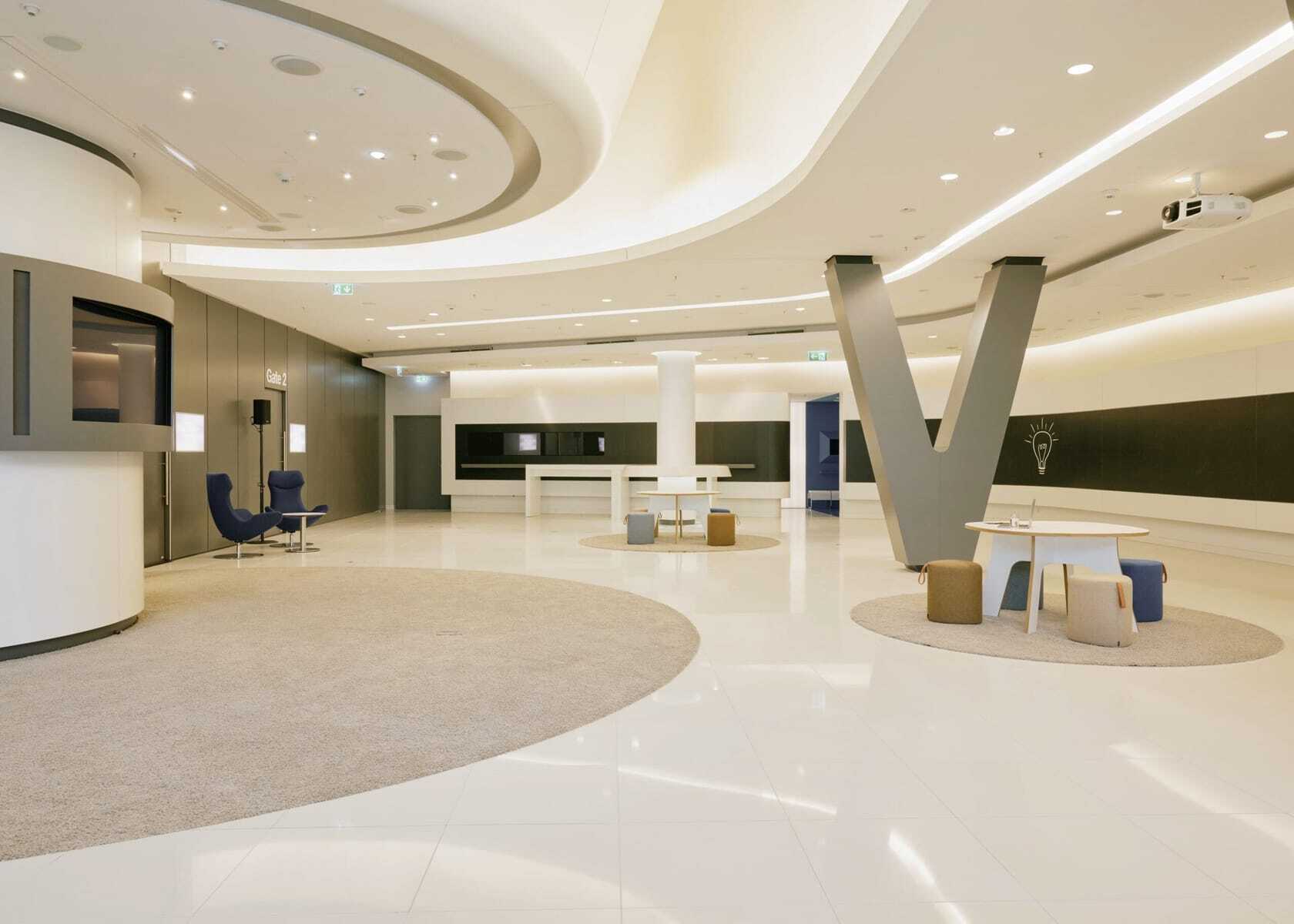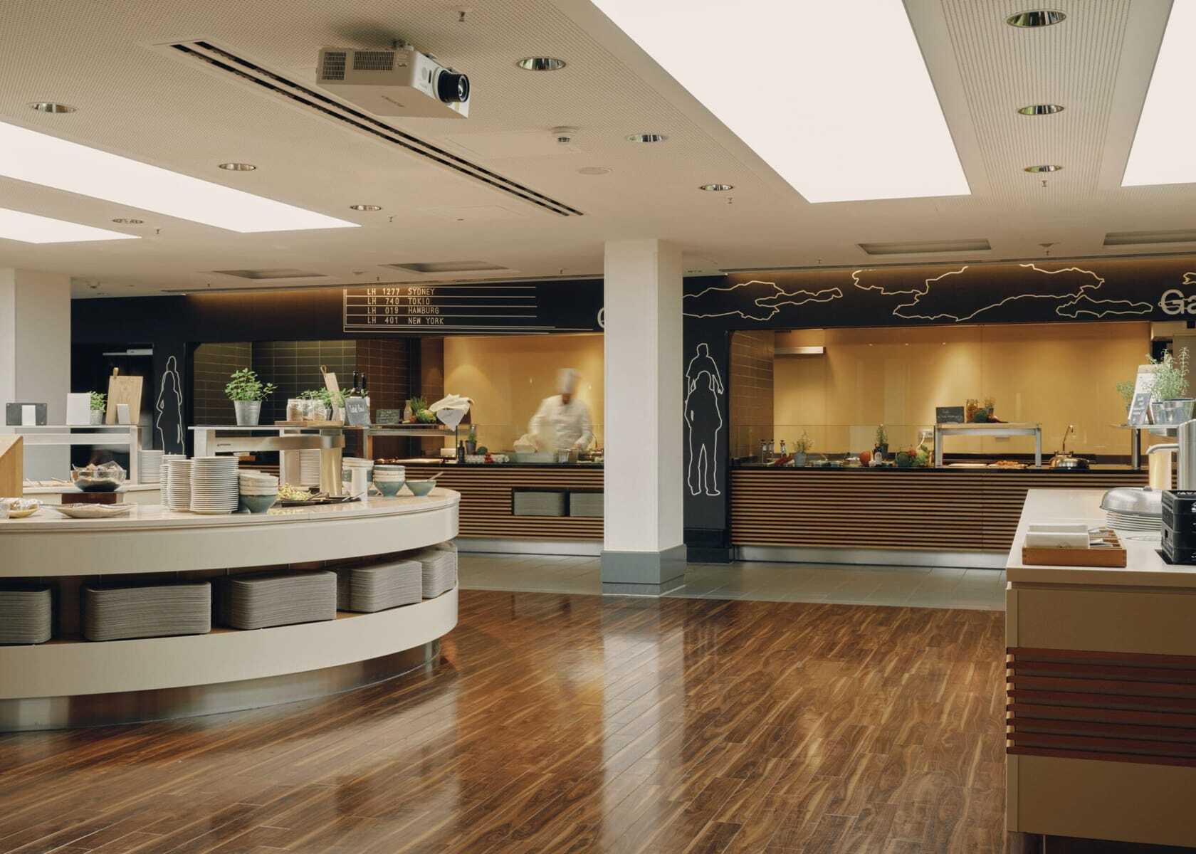 Unterschiedlichste Räume, die keineswegs nur der Lufthansa, sondern jeglichen Veranstaltern offenstehen – vom großen »Bonhoeffer-Saal« für circa 600 Personen und das bereits erwähnte »Think Terminal« über ein »Loft« mit mobilen Kochstationen für Kochevents und sogenannten »Living Rooms« mit Wohlfühlatmosphäre bis hin zu diskreten Boardrooms und bestens ausgestatteten Seminarräumen. Alle angeschlossen an großzügige »Open Areas«, sprich: Foyers und Pausenzonen mit Coffee Bars, Brainfoodstationen und Gruppenarbeitsplätzen.