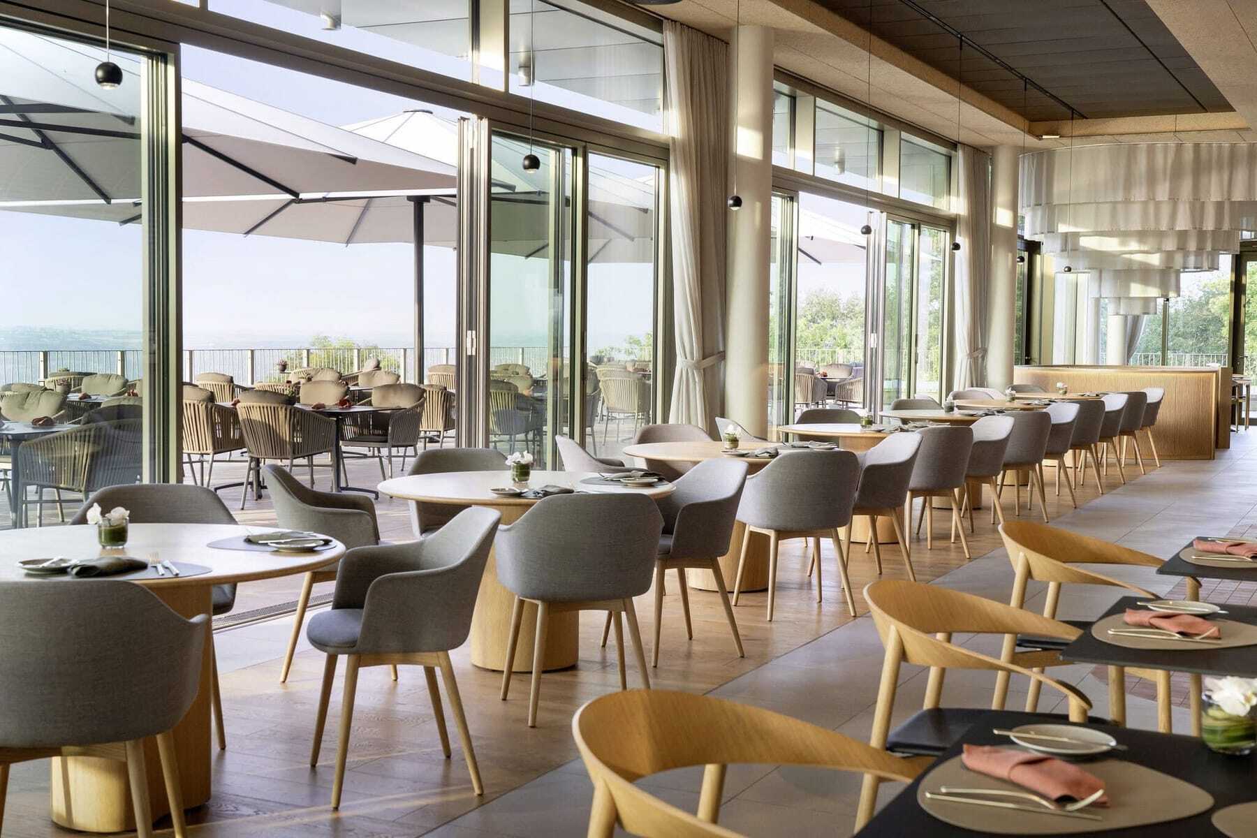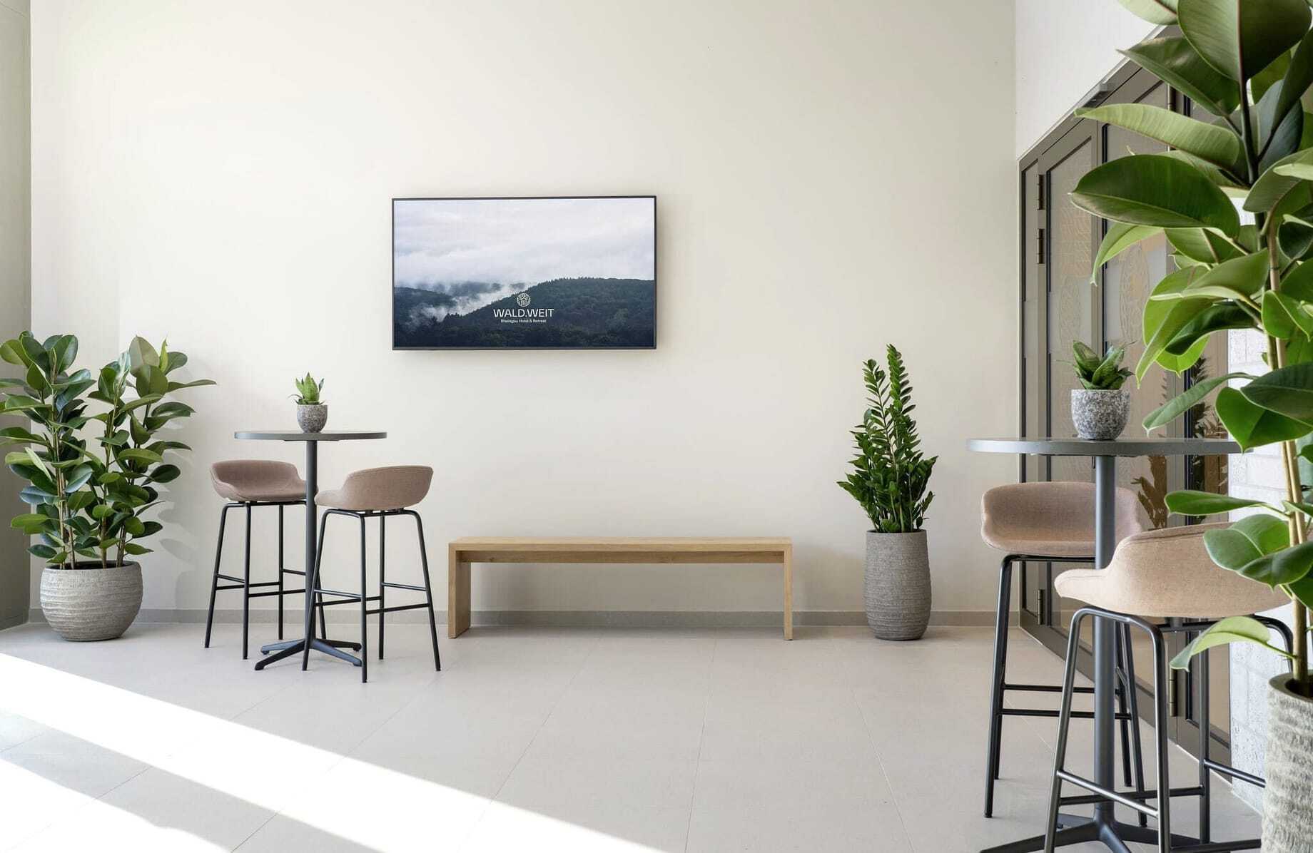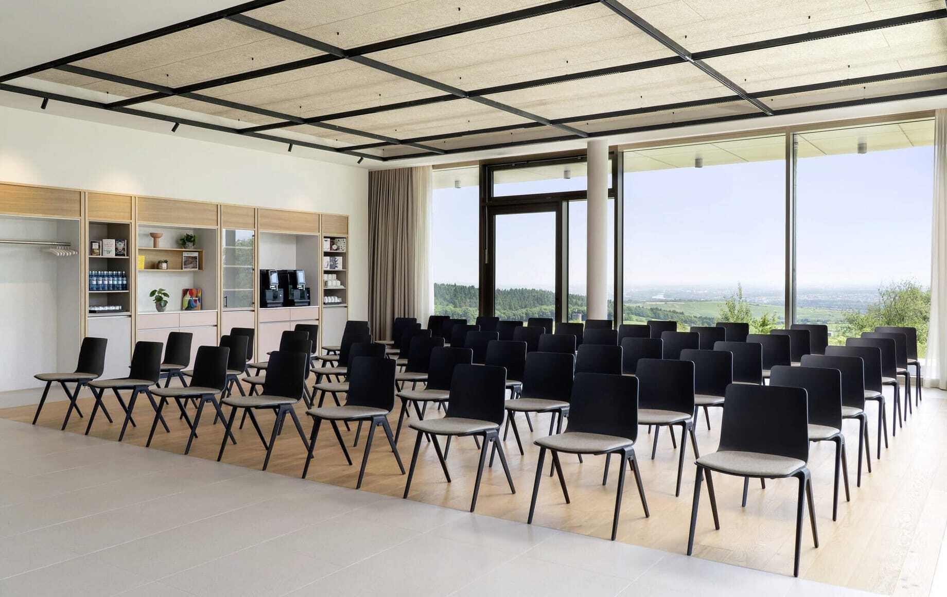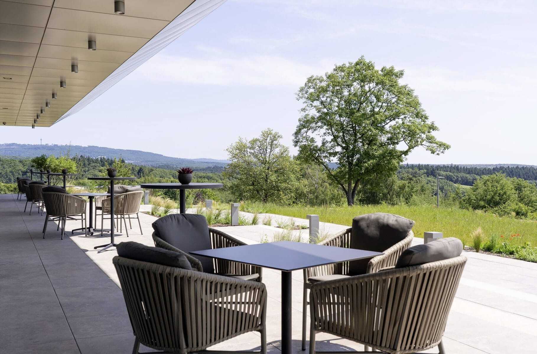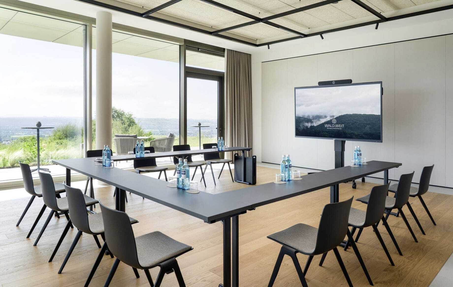 »Ja, dieser Blick ist einer unserer größten USPs«, bestätigt Hoteldirektor Malte Budde lachend, »bei schönem Wetter können wir die Flugzeuge am Frankfurter Flughafen landen sehen.« Und natürlich die Lage des Hotels. Nur 35 bis 40 Minuten Fahrzeit von eben diesem Flughafen entfernt liegt das WALD.WEIT dennoch Lichtjahre weit weg vom Alltag. Es erinnert mehr an ein Retreat als an ein Tagungshotel. Dies stellt wiederum beste Voraussetzungen für Strategiemeetings oder Führungskräftetagungen dar, die Rückzug und Ruhe erfordern. Der weite Blick beschert klare Sicht und neue Perspektiven, die erdige Waldluft erfrischt und inspiriert. Alle Tagungsräume liegen auf einer 258 Quadratmeter großen Panorama-Eventetage, die durch ihre bodentiefen Fenster das Draußen nach drinnen holt. Alle verfügen über einen direkten Zugang zur Terrasse (mit Blick), die ebenso wie die Räume ebenerdig befahrbar ist.