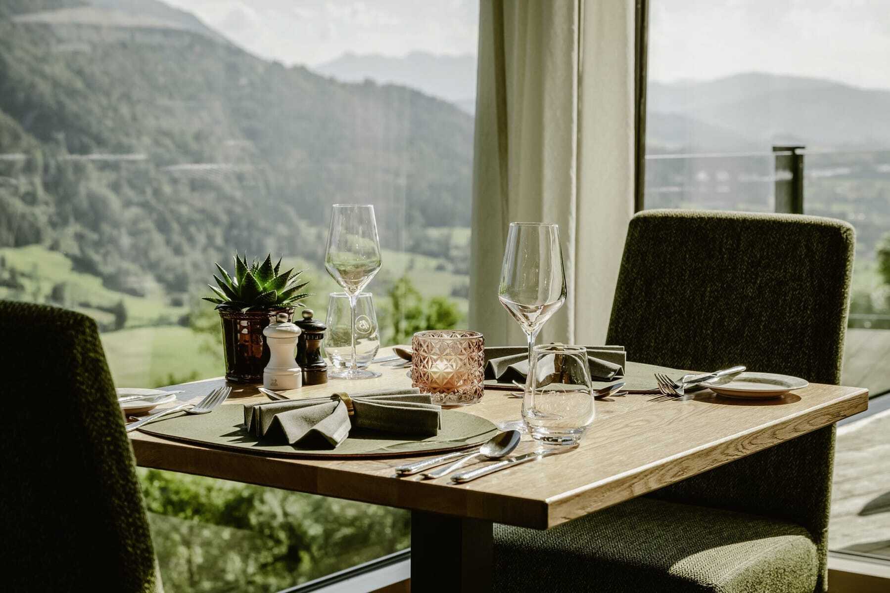 Zur Selbstfürsorge trägt auch die innovative, alpenländisch-mediterrane Küche bei, in der auf Zucker und Weißmehl verzichtet wird. Zum Ausklang empfehle ich unbedingt einen Abstecher in die schicke »HansiBar« (benannt nach dem Hirsch aus dem angrenzenden Rotwildgehege) – mit ihrem Weitblick ins Tal. Da fällt mir ein: Auf der Fahrt bin ich hinter einem Shuttle-PKW des Bergkristall hergefahren mit der Aufschrift: »Folgen Sie uns ins Paradies.« Wie treffend!