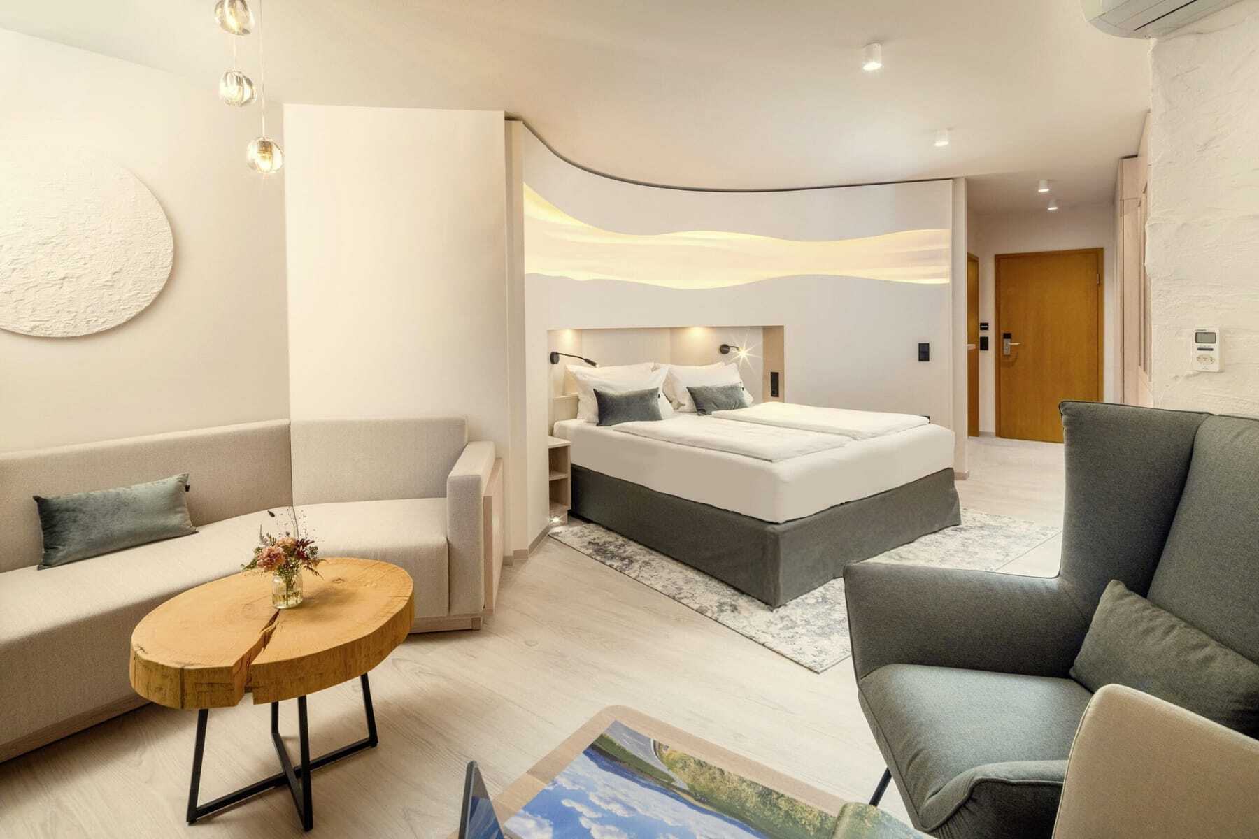 Suite im Kurhotel an der Obermaintherme mit taupefarbenem Bett in einer Nische und Tisch aus einer Baumscheibe