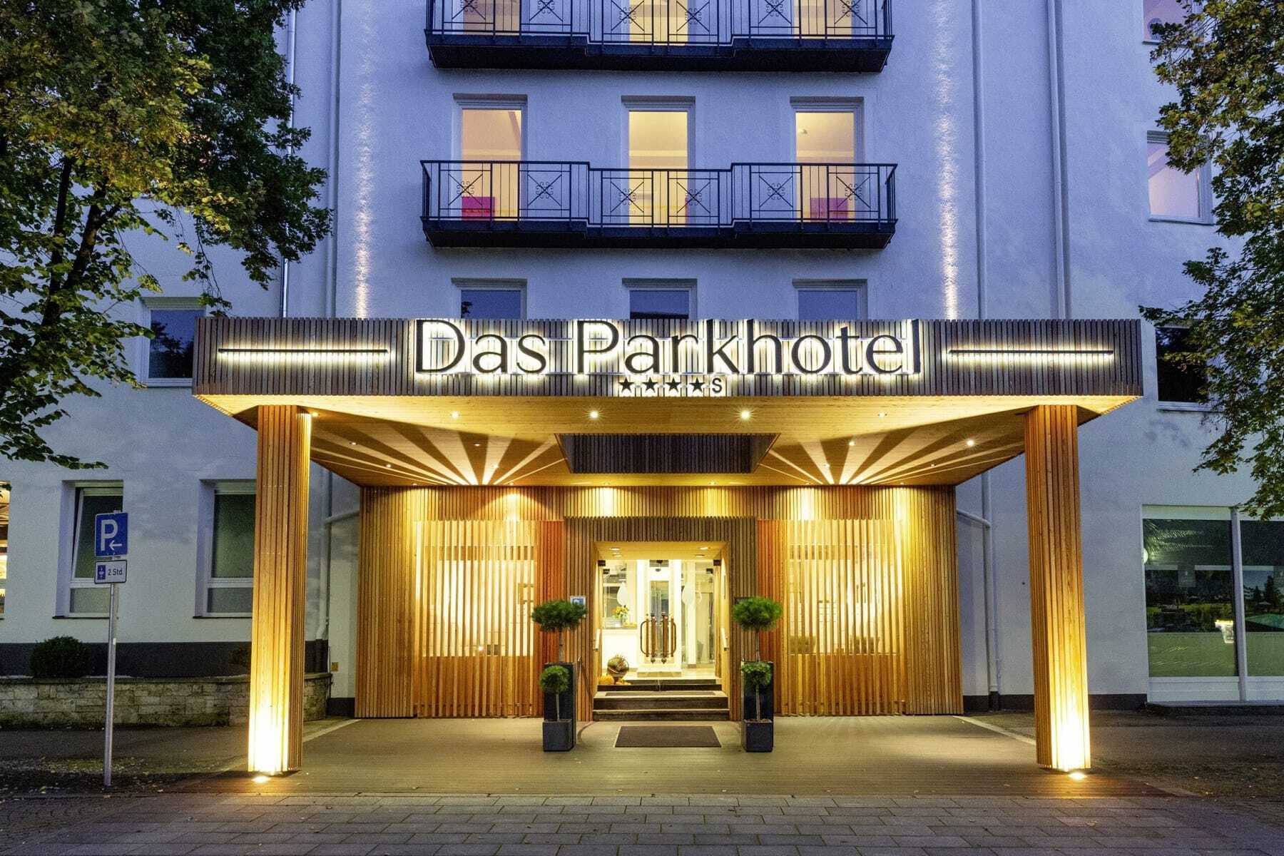 Zimmer im Das Parkhotel mit freistehender Badewanne und grauem Sofa