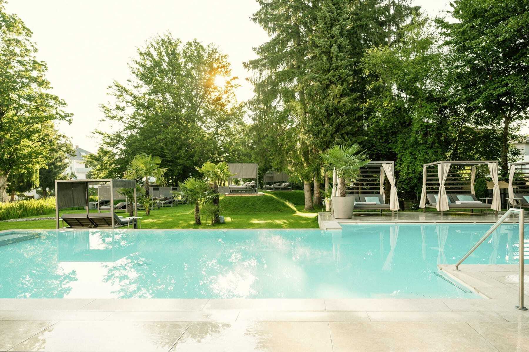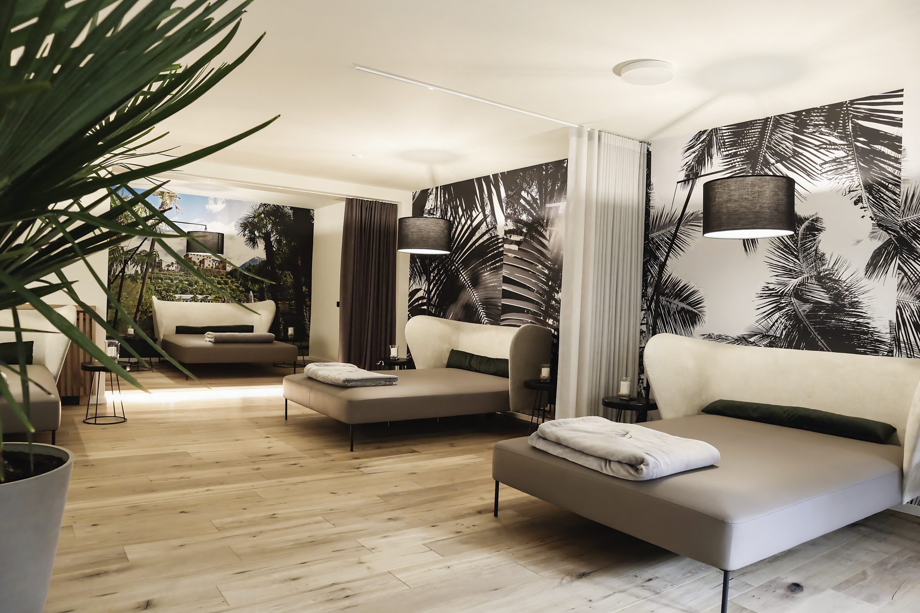 Viel Holz, Südtiroler Stoffe und natürliche Materialen prägen den gemütlichen Eingangsbereich ebenso wie die großzügigen und modernen Zimmer und Suiten. Von den Balkonen aus schweift der Blick über die Parkanlage und den von Palmen gesäumten Infinitypool, der zum 2.500 Quadratmeter großen Spabereich gehört. Beim Floaten in dessen wohltemperiertem Wasser und beim Ruhen auf einem der großzügig verteilten Daybeds stellt sich unmittelbar ein echtes Meran-Feeling ein. Schlechtes Wetter? Kein Problem. Der Indoorpool, die Saunen und ein Osmanisches Dampfbad sind die passenden Alternativen. Besonders einfallsreich gestaltet sind auch die Ruhebereiche, die nach den verschiedenen Holzarten benannt wurden, mit denen sie ausgestattet sind. Allein der Duft nach Zirbe! Herrlich! »Loss di vergweinen« heißt es dann auch bei den Beauty- und Wellnesstreatments. Hier kommen ausschließlich naturbelassene Produkte der renommierten Südtiroler Marken Piroche und Luis Trenker zum Einsatz.