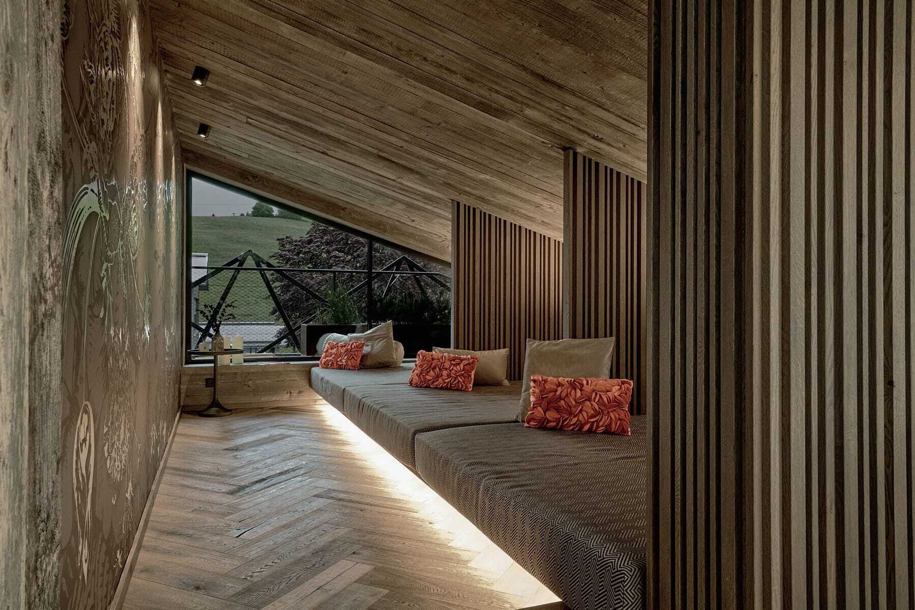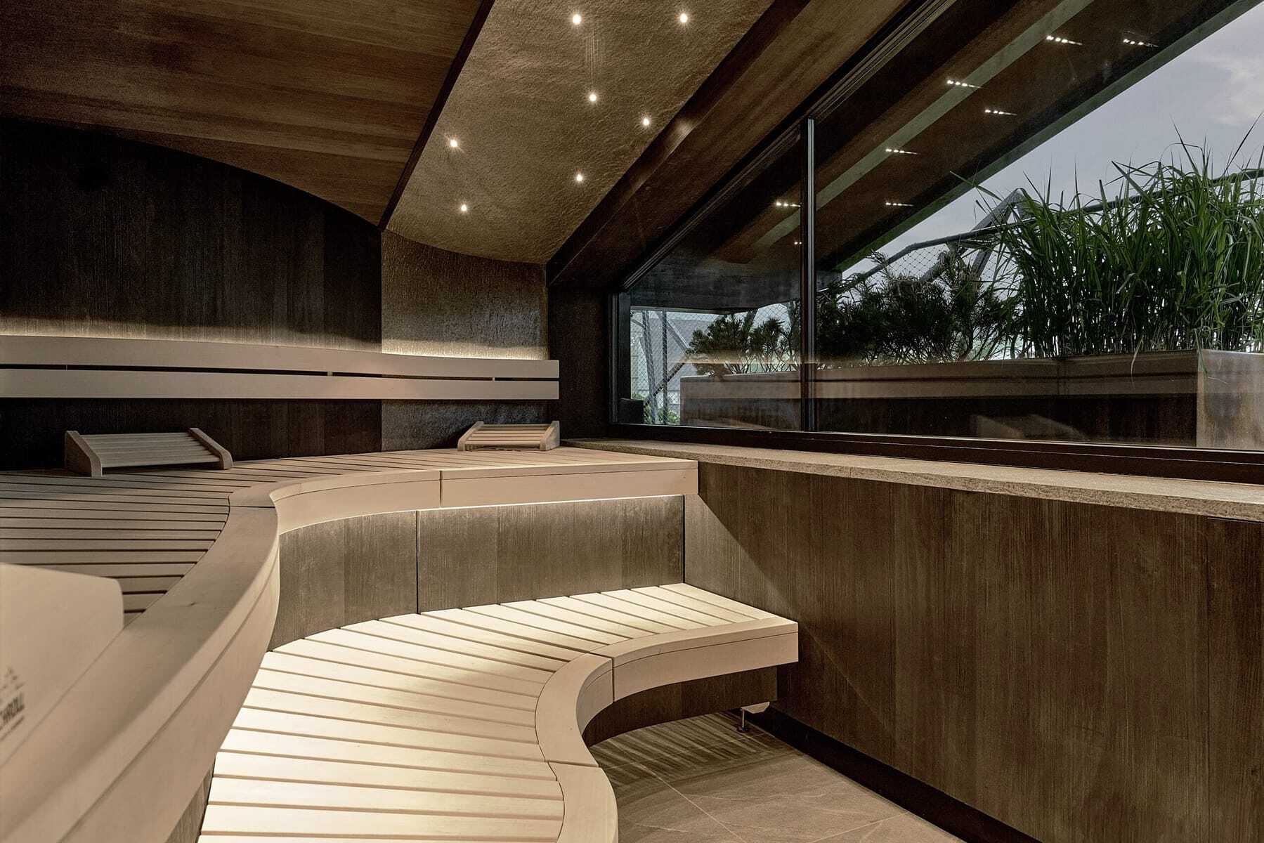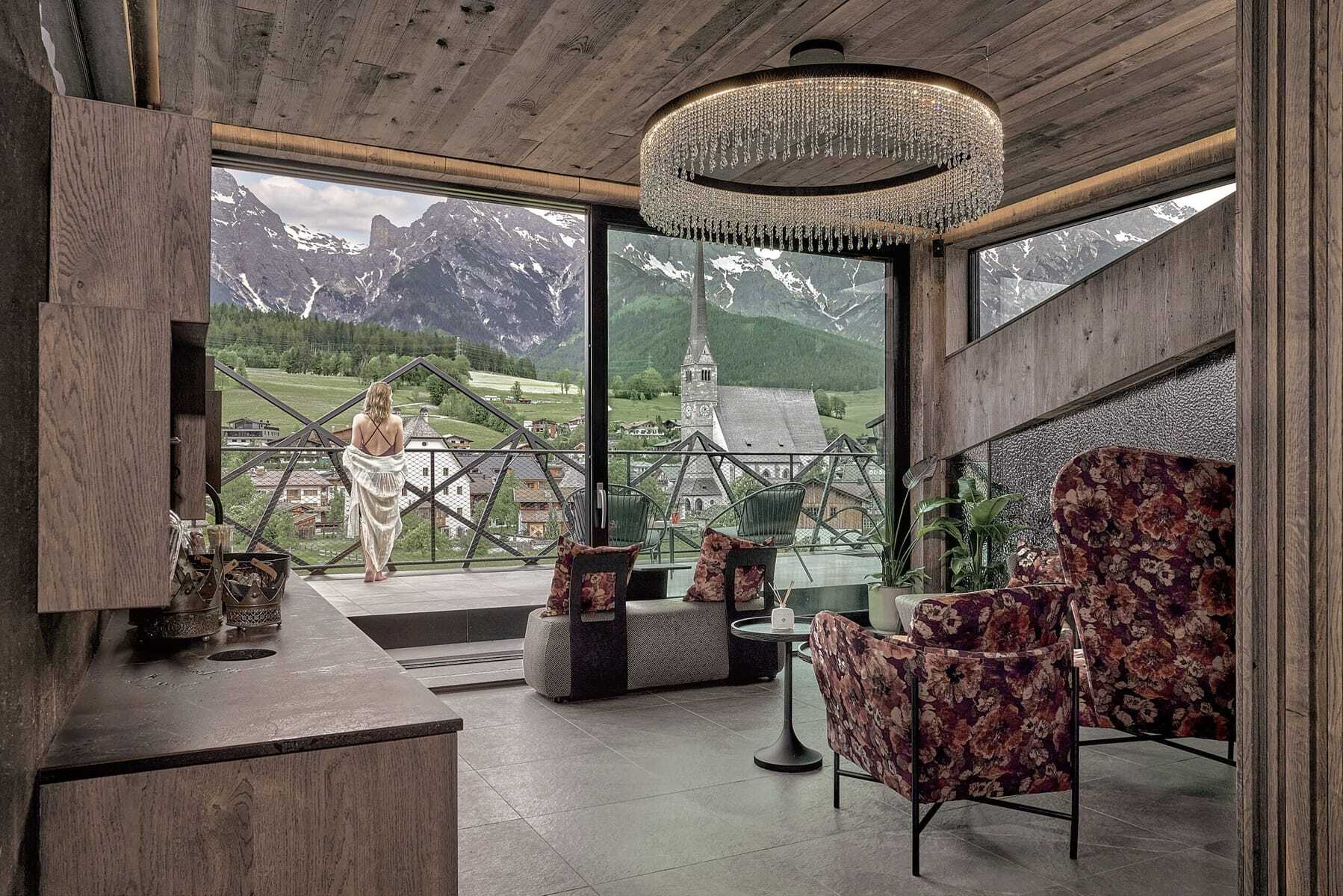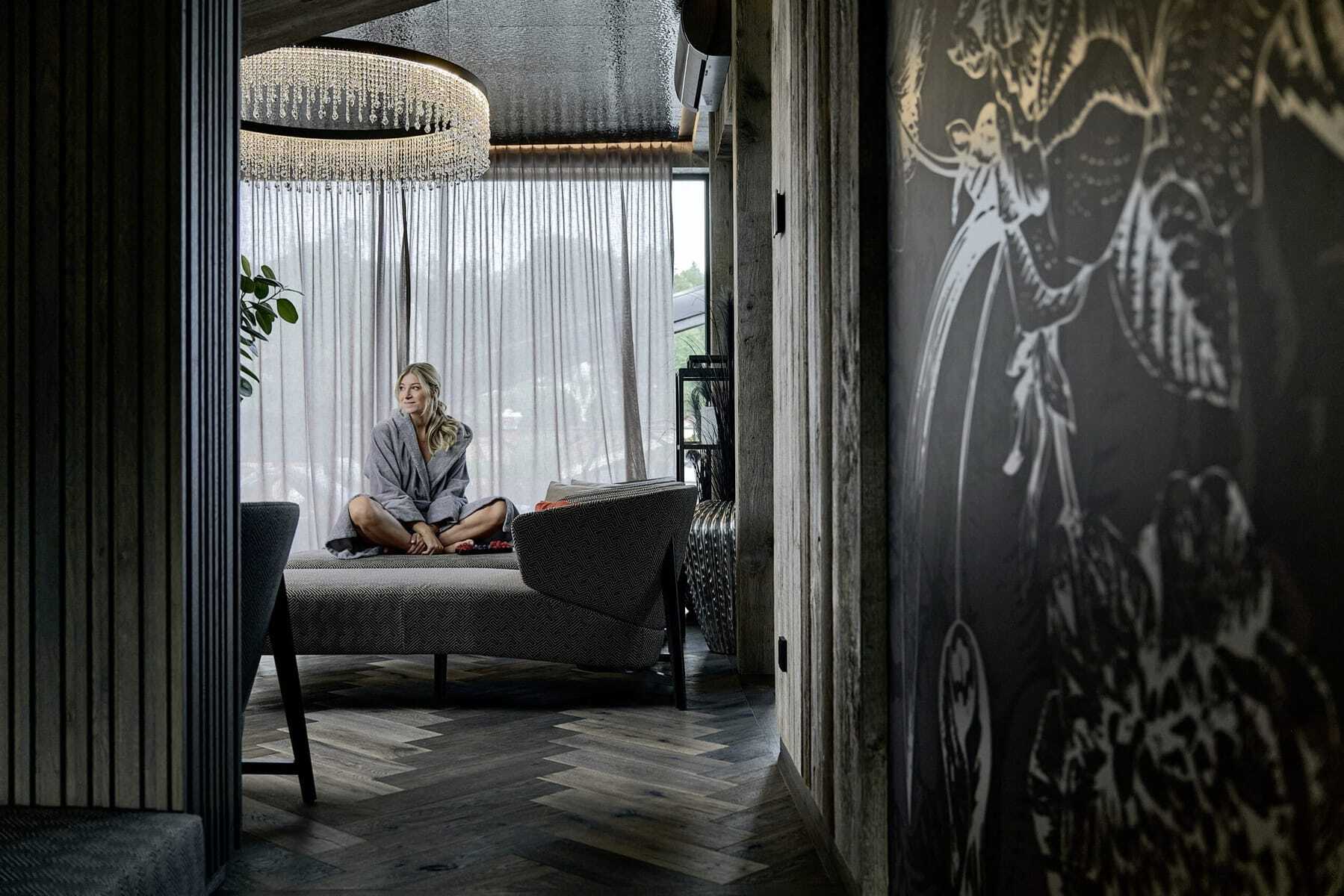Kann man einem Haus eine Krone aufsetzen? Sehr wohl! In diesem Fall ist es die weibliche Form der Krone, eine Tiara. So heißt auch das neue Adults only-Spa der HOCHKÖNIGIN. Filigran und erhaben schmückt es das Dach. Mit unverbautem Rundumblick auf die majestätischen Salzburger Berge: Hochkönig, Steinernes Meer, Leoganger Steinberge und Pinzgauer Grasberge. Diese Aussicht lässt sich aus dem beheizten Außenpool auf der Dachterrasse oder durch die großen Glasfronten von gemütlichen Longchairs, Kuschelnischen und der Sauna aus bestaunen. Im Inneren dominieren dunkle Grautöne und hochwertige Materialien, Swarovski-Kristalle funkeln. Der Stil: edel und urban, mitten in dem Salzburger Bergdorf mit der markanten Kirchturmspitze.