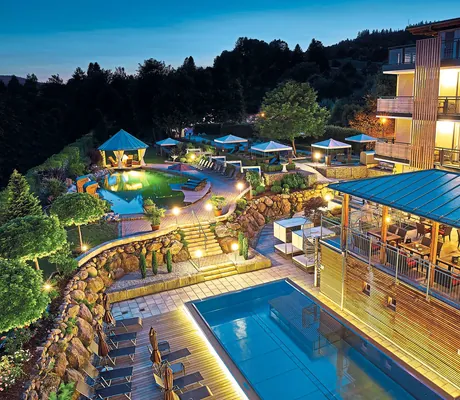 »Stylisch bayerisch« lautet das Motto, das sich optisch mit oft ungewöhnlichen Ideen zeigt, in großzügigen Gästezimmern mit hochwertiger Ausstattung, modernem Dekor und schicken Extras wie den Jacuzzis auf einigen Suiten-Balkonen. Dabei beweist die Gastgeberin Sandra Geiger-Pauli, dass sich Wellness durchaus auch mit Familienurlaub verträgt: Die dreifache Mutter schafft durch strikt getrennte Bereiche ein Wohlfühlszenario für die unterschiedlichen Gästekreise. So planschen Eltern mit ihren Kids in einem Extra-Pool, sie haben eine Textilsauna, ein Outdoorgelände zum Austoben und ein eigenes Familien-Kinderrestaurant.